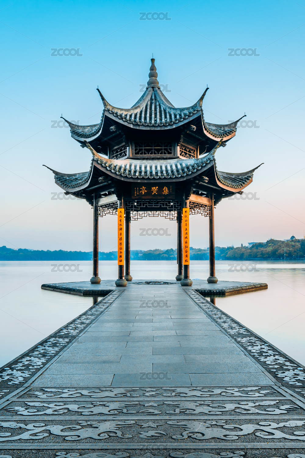 Jixian pavilion during sunrise in hangzhou,Zhejiang province,China with all Chinese words on it only introduces itself which means "Jixian Pavilion" without advertisement.