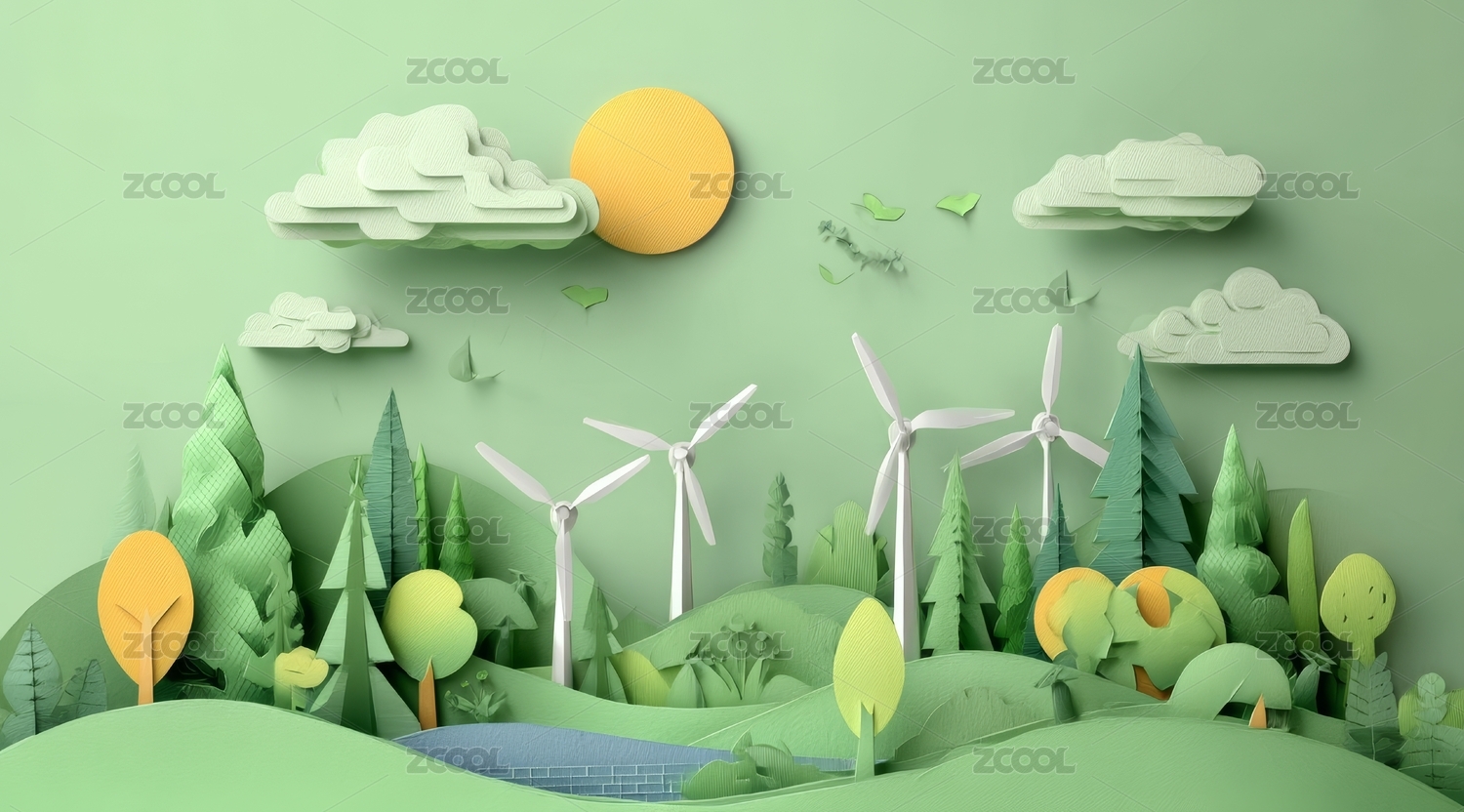 可再生能源,绿色能源,风电,风车,剪纸,剪纸风格,城市,天空,建筑,插画
