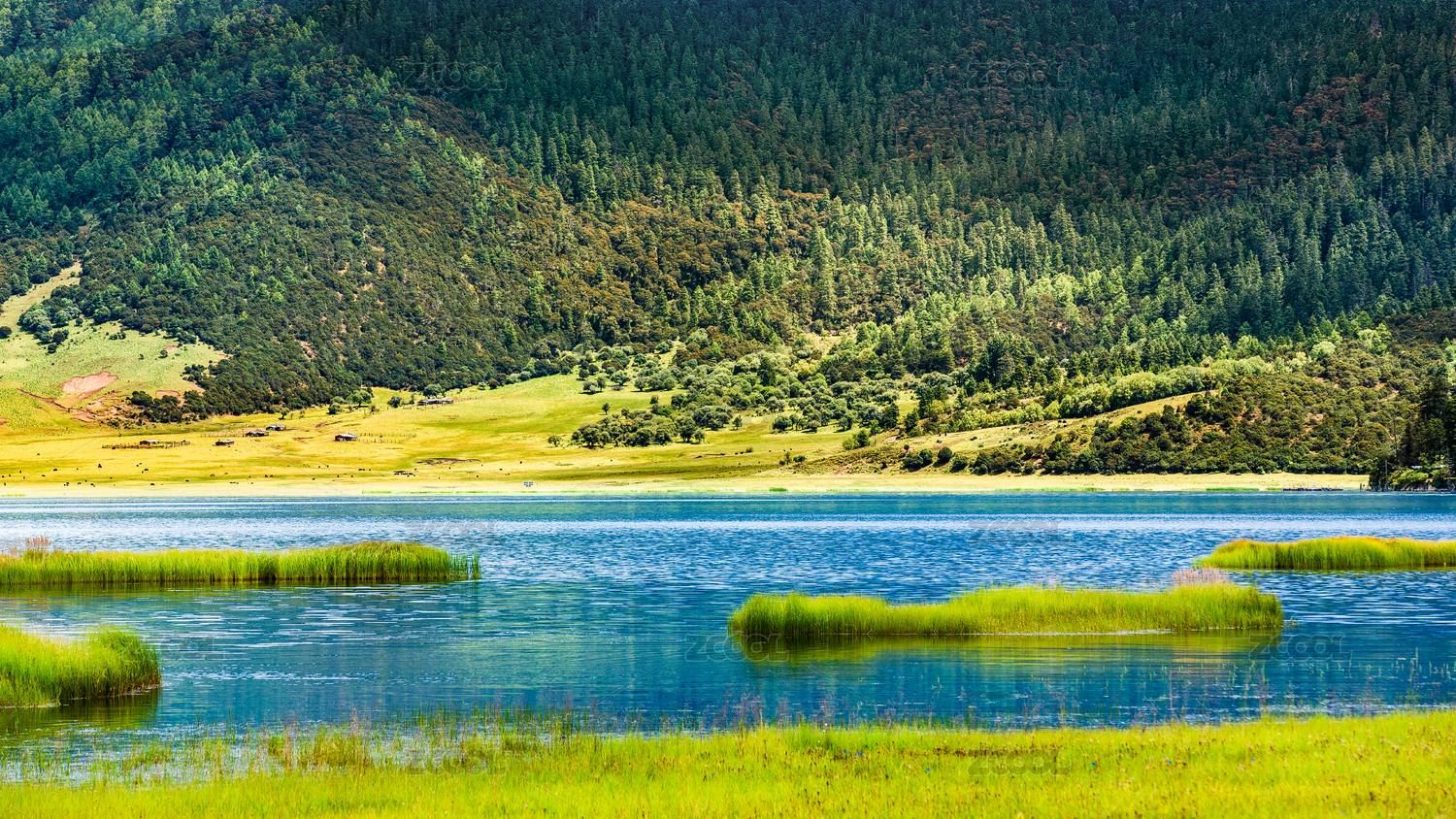 云南,中甸,香格里拉,湿地公园,湖水,湖面,平静,宁静,炊烟,草