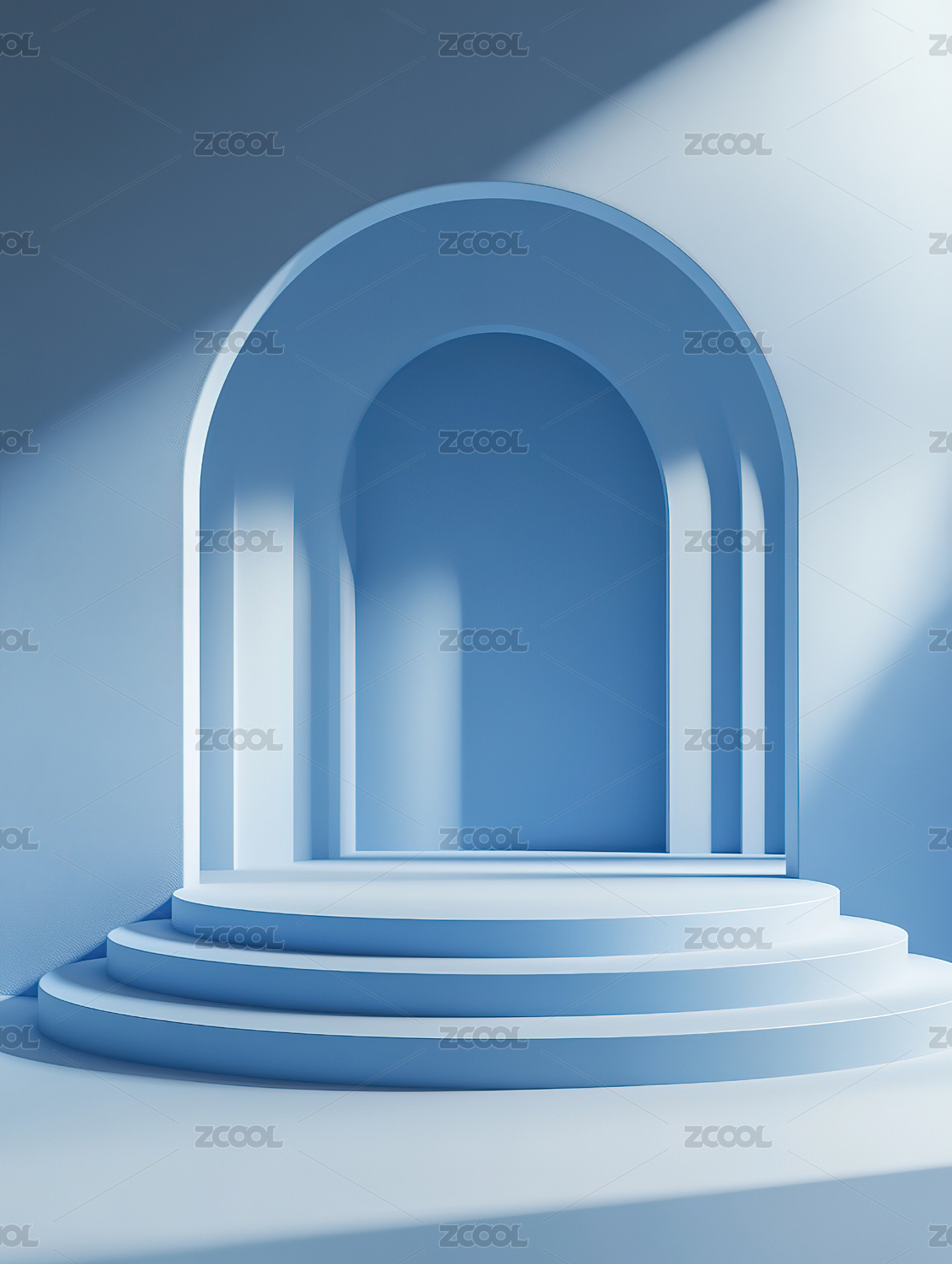 蓝色空间中的白色圆形展台