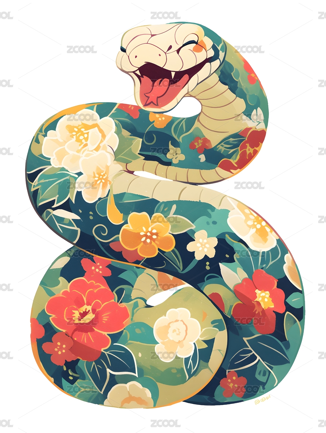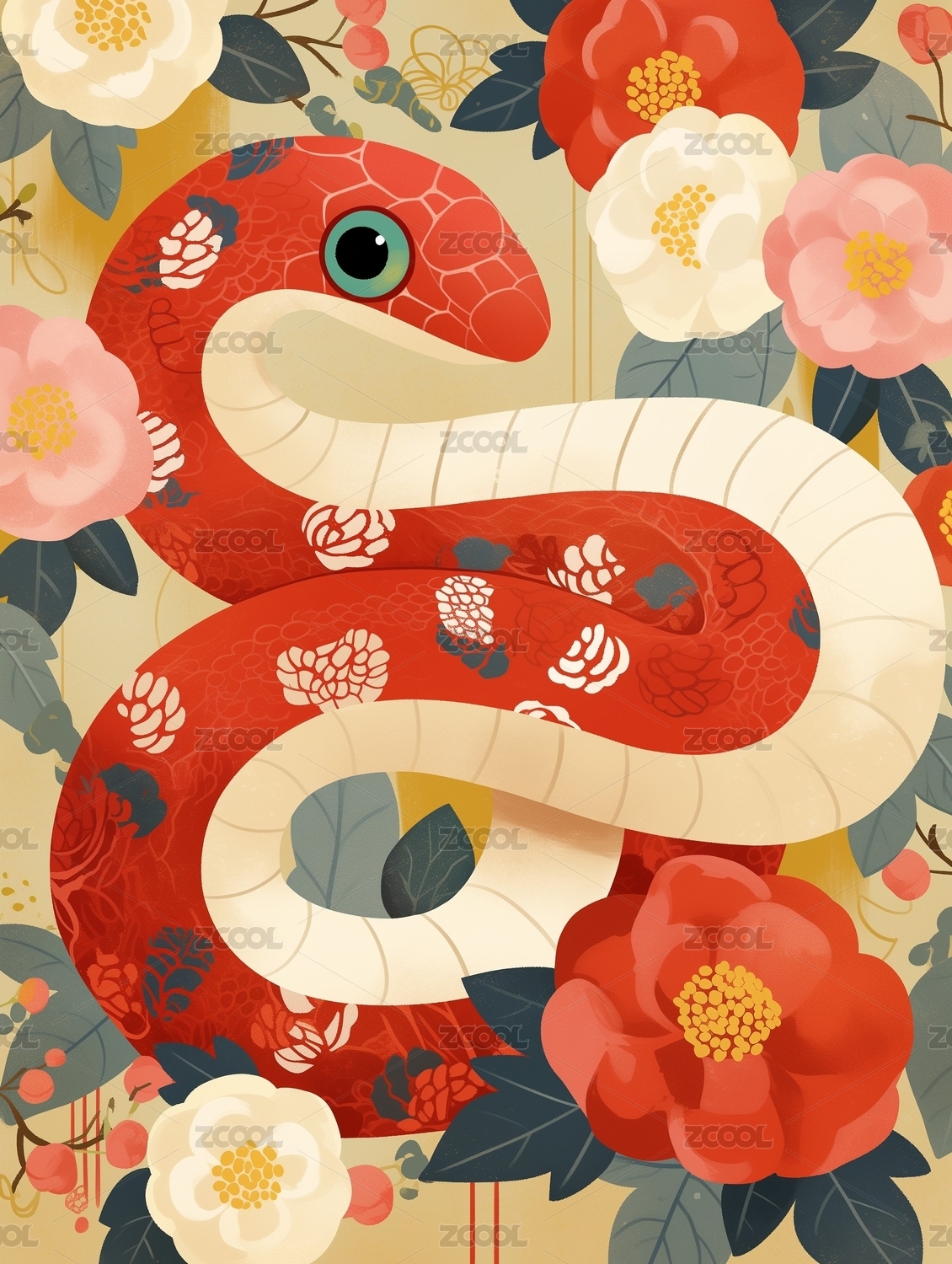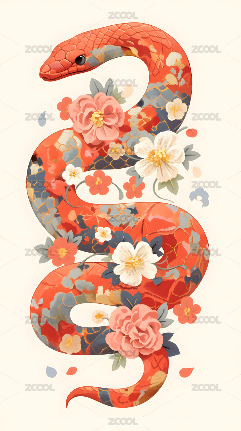 喜庆的复古风格五彩斑斓的蛇和花朵
