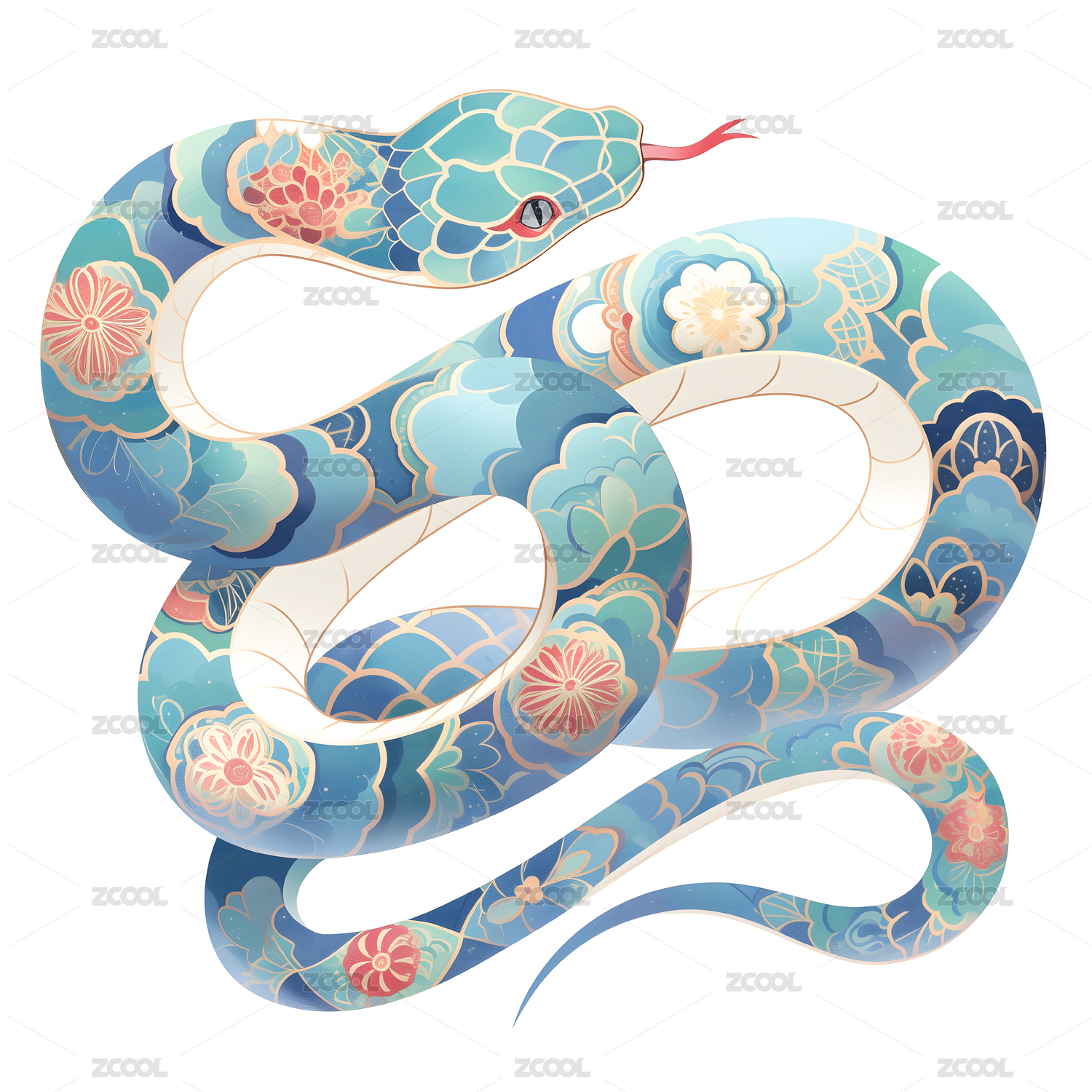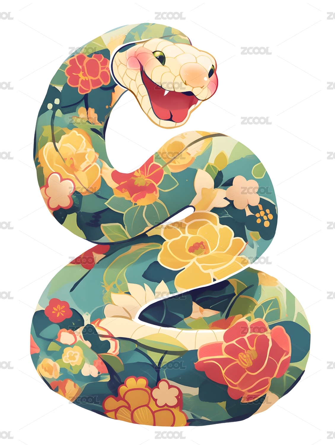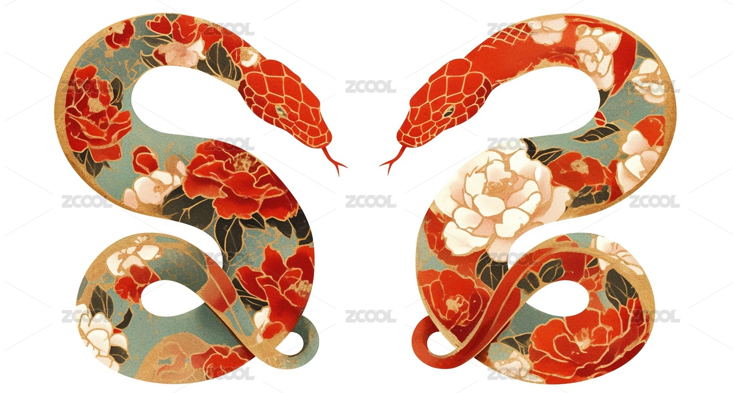 喜庆的复古风格五彩斑斓的蛇和花朵