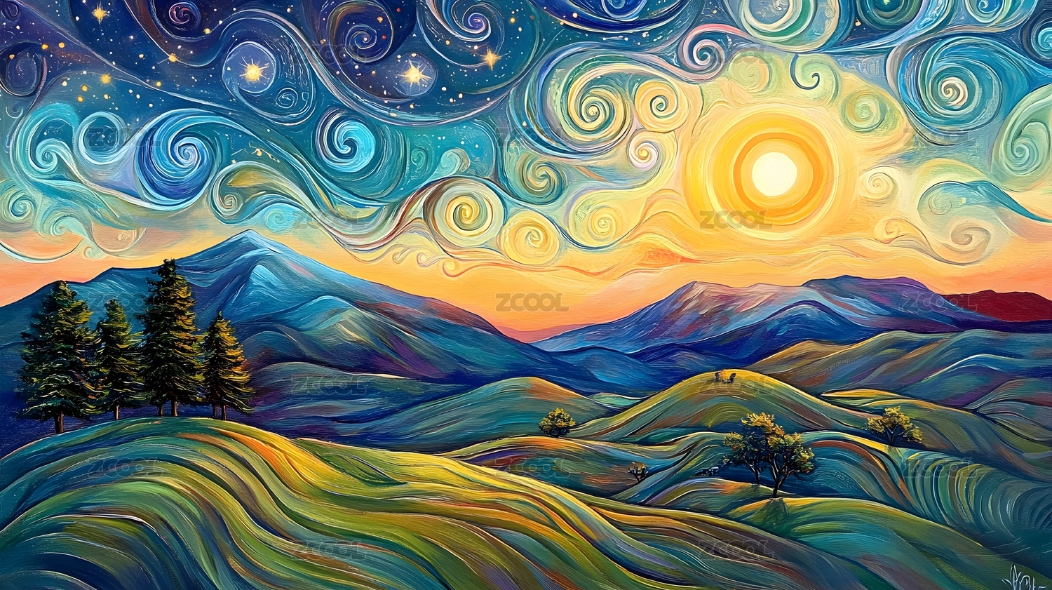 奇幻抽象梦幻星空下的山峦