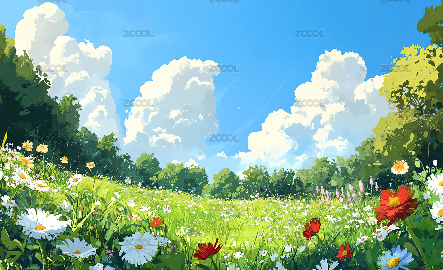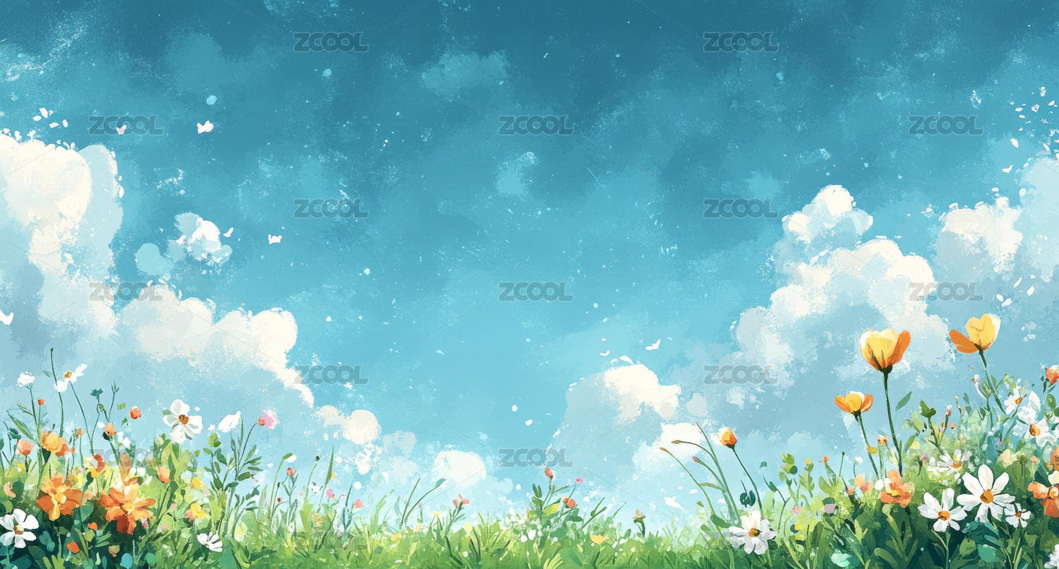 蓝天白云下的鲜花与草地插画