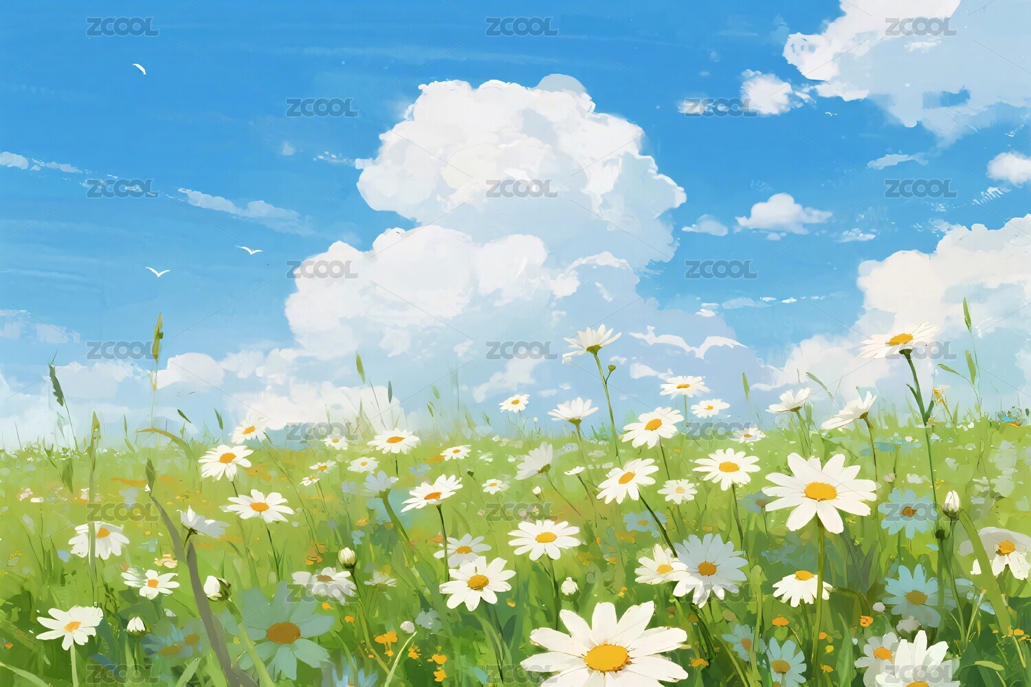 蓝天下的草地雏菊插画背景