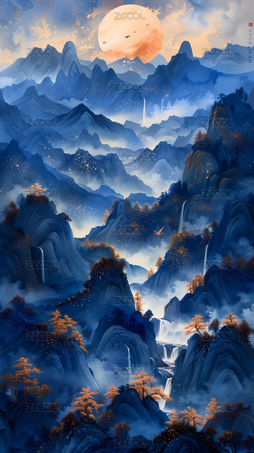 艺术描金蓝调日出山水画海报背景