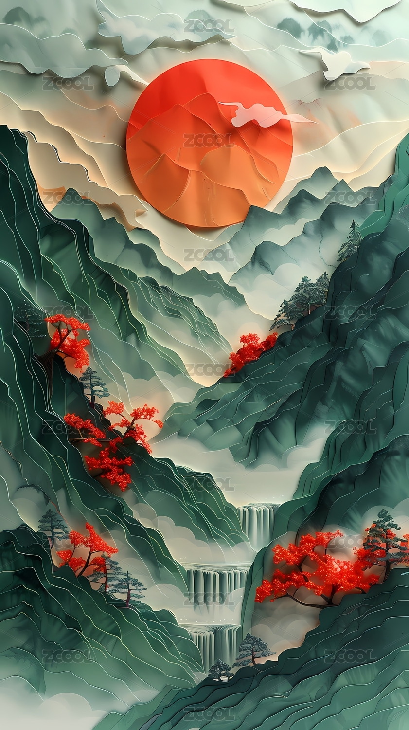 传统红太阳山水插画海报背景装饰画