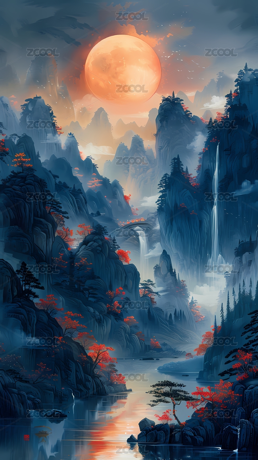 金色月亮下的水墨山水画