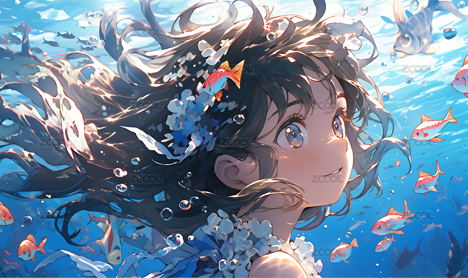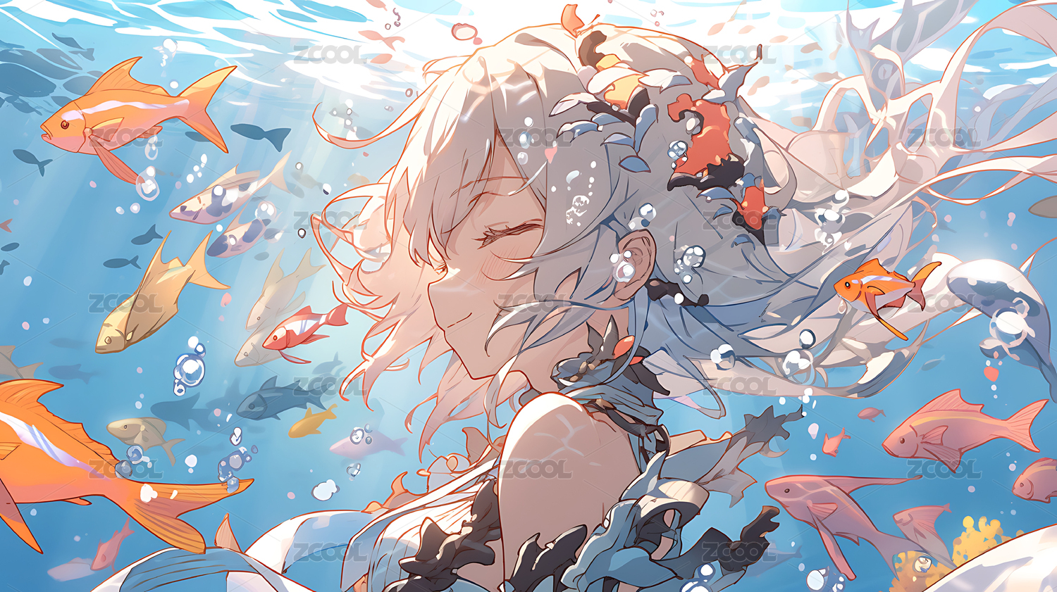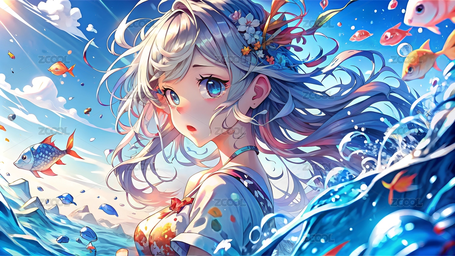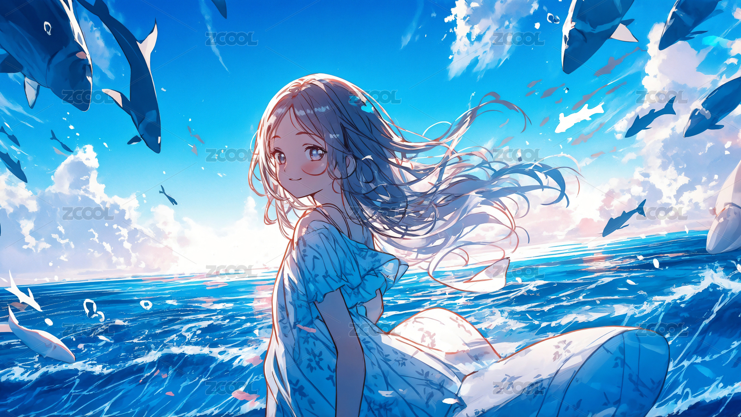 女性,人像,女孩,清新,二次元,天空,云朵,海洋,鱼群