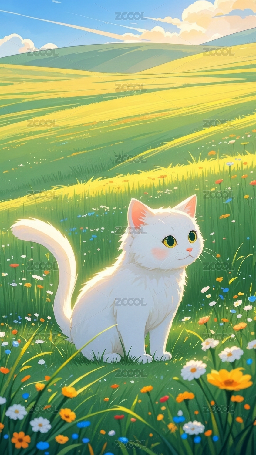 插画,猫咪,自然,绿色,植物,花朵,写作业
