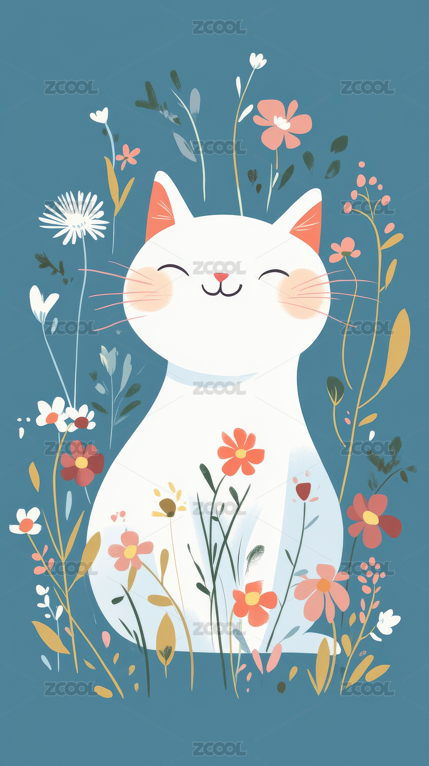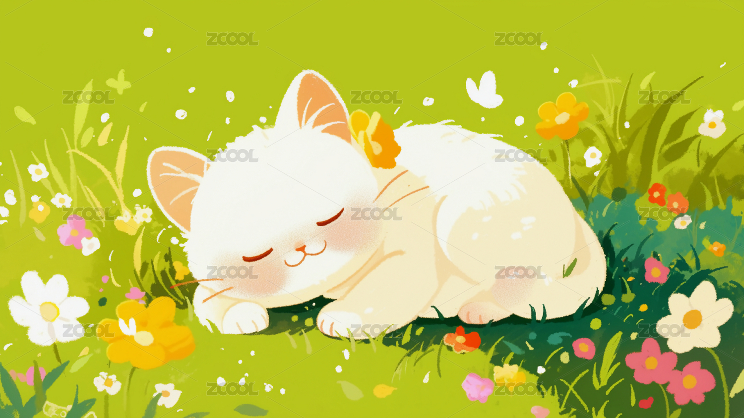 插画,猫咪,自然,绿色,植物,花朵,睡觉