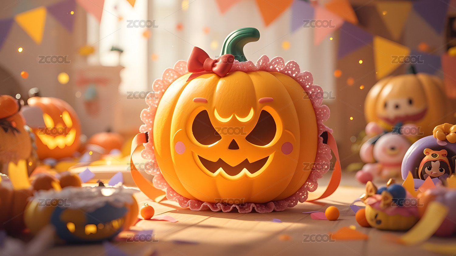 万圣节南瓜灯与玩偶装饰场景充满童趣