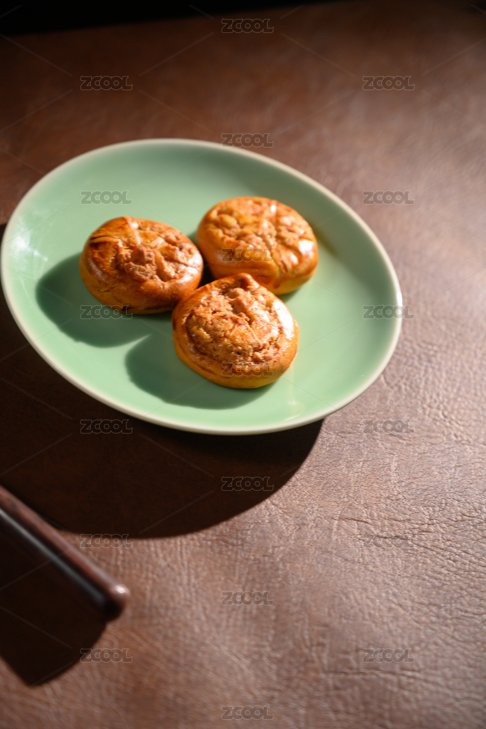 木桌上的长白盘里的吃火锅小吃南瓜饼