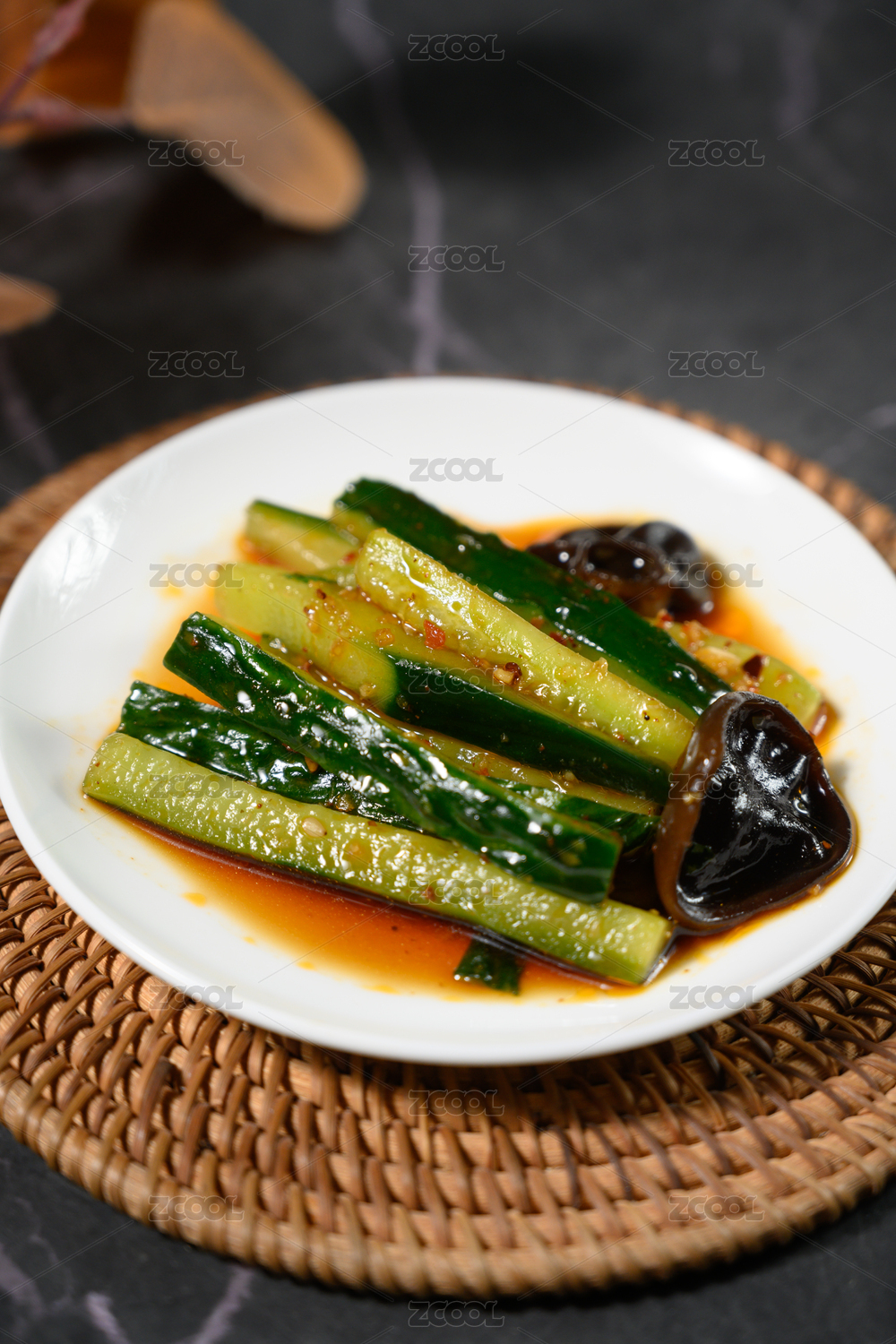 桌面上的盘子里的美味可口的凉拌青瓜