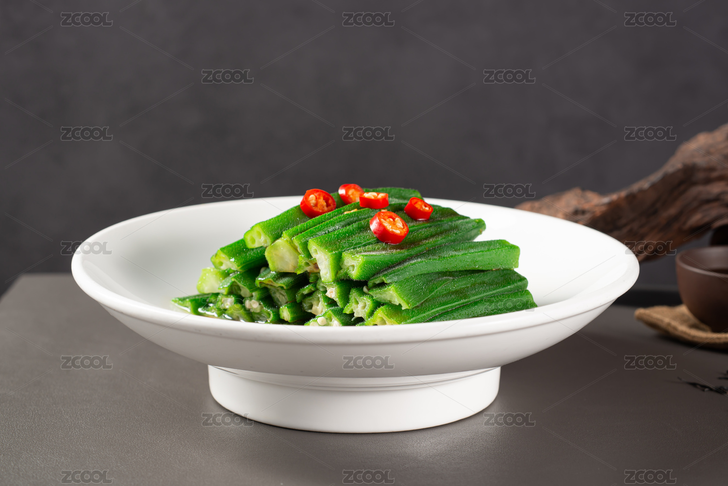 深棕色盘子上碗里的鲜椒凉拌秋葵