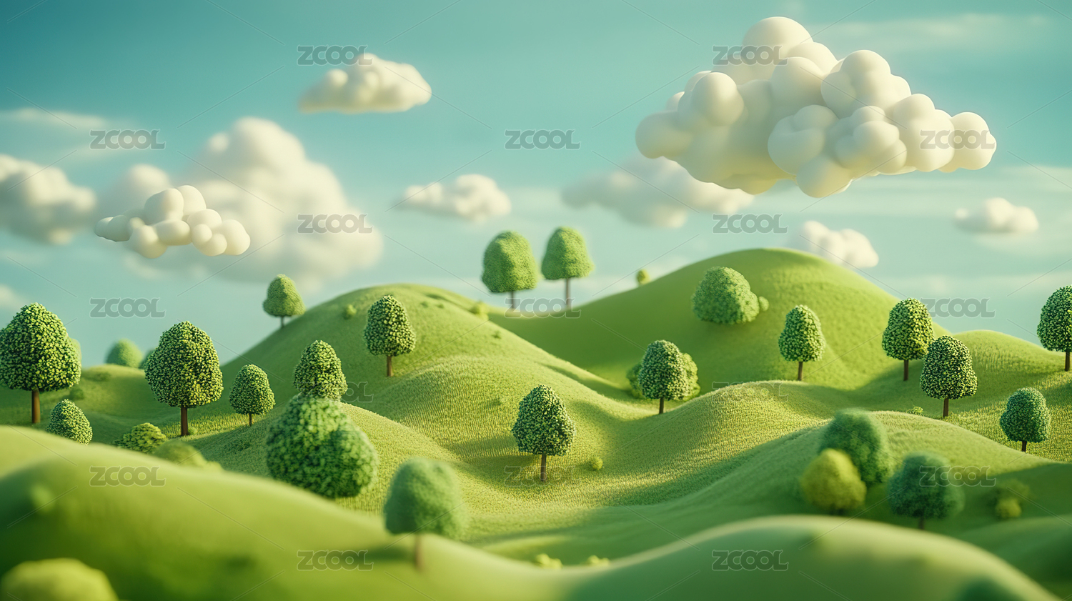 航拍视角绿色的森林与高山蓝天白云风景3D