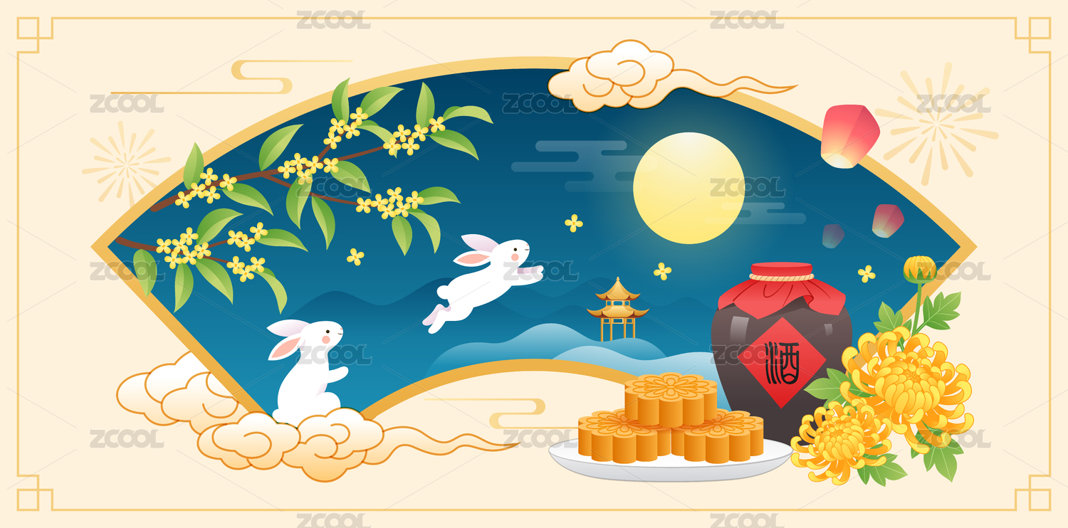 中秋赏月云纹玉兔月饼荷花横竖版插画
