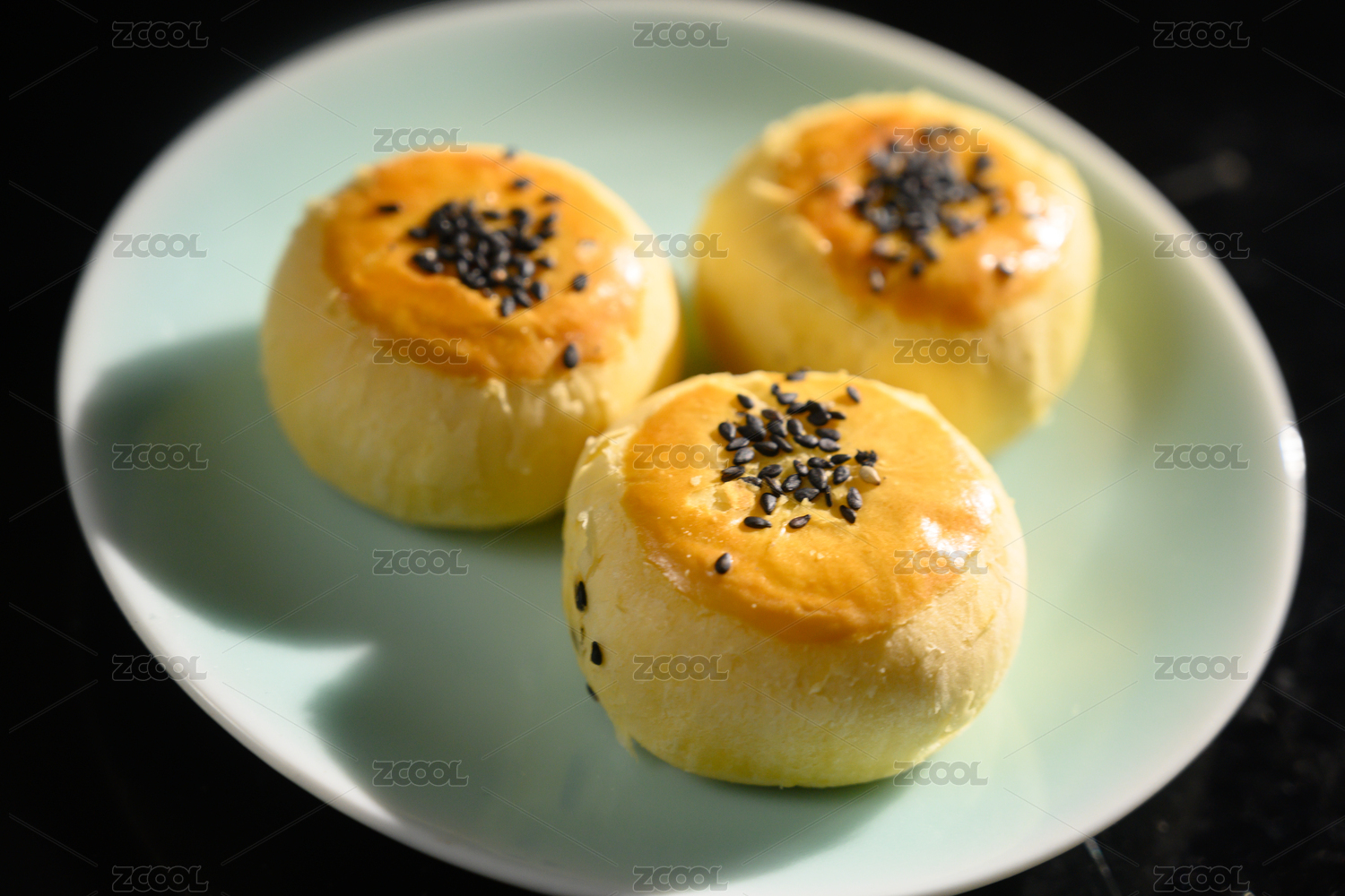 圆圆的黄色酥饼在黄金的多个蛋黄流心酥中间