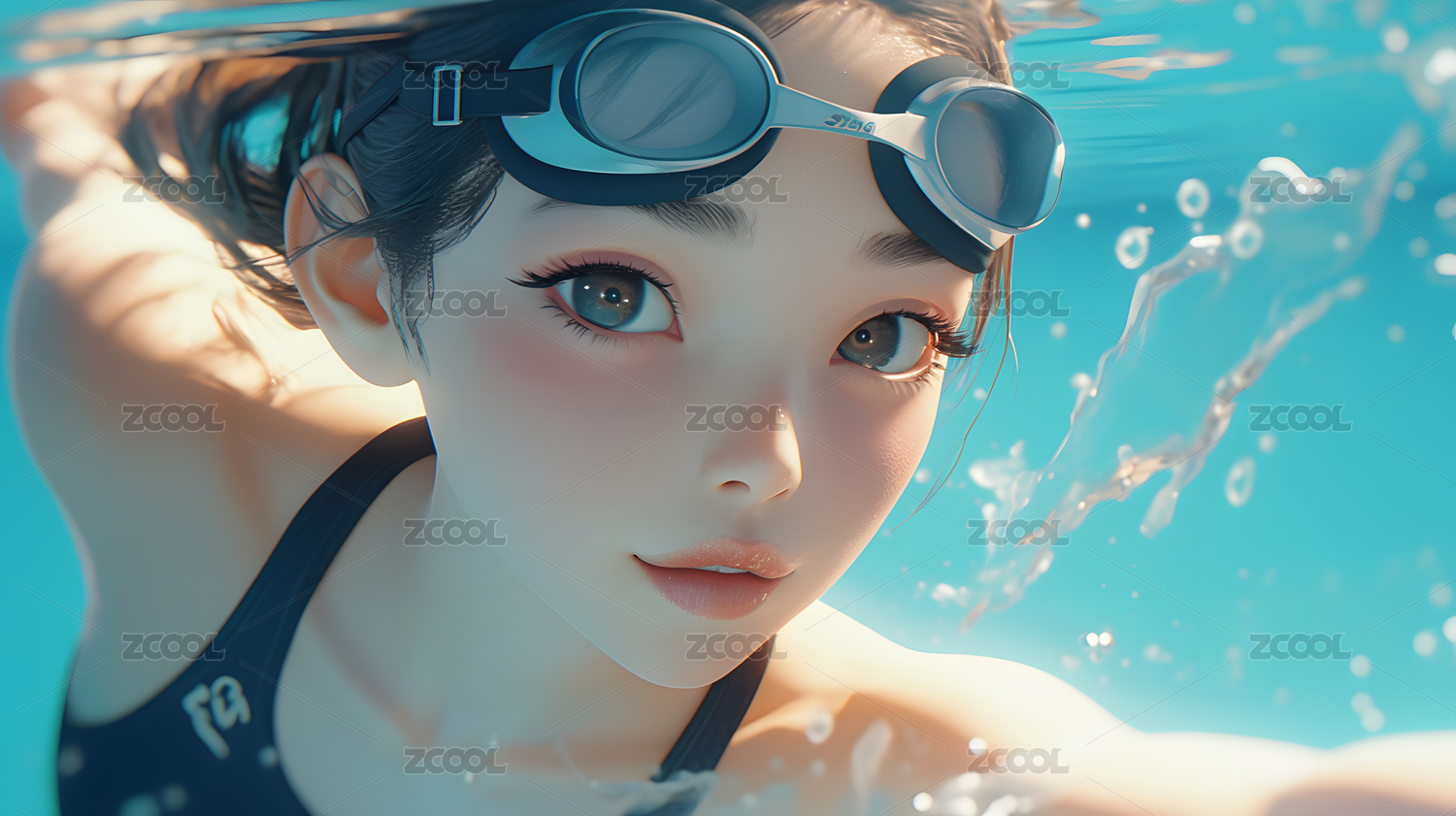 3D游泳的女孩面对镜头