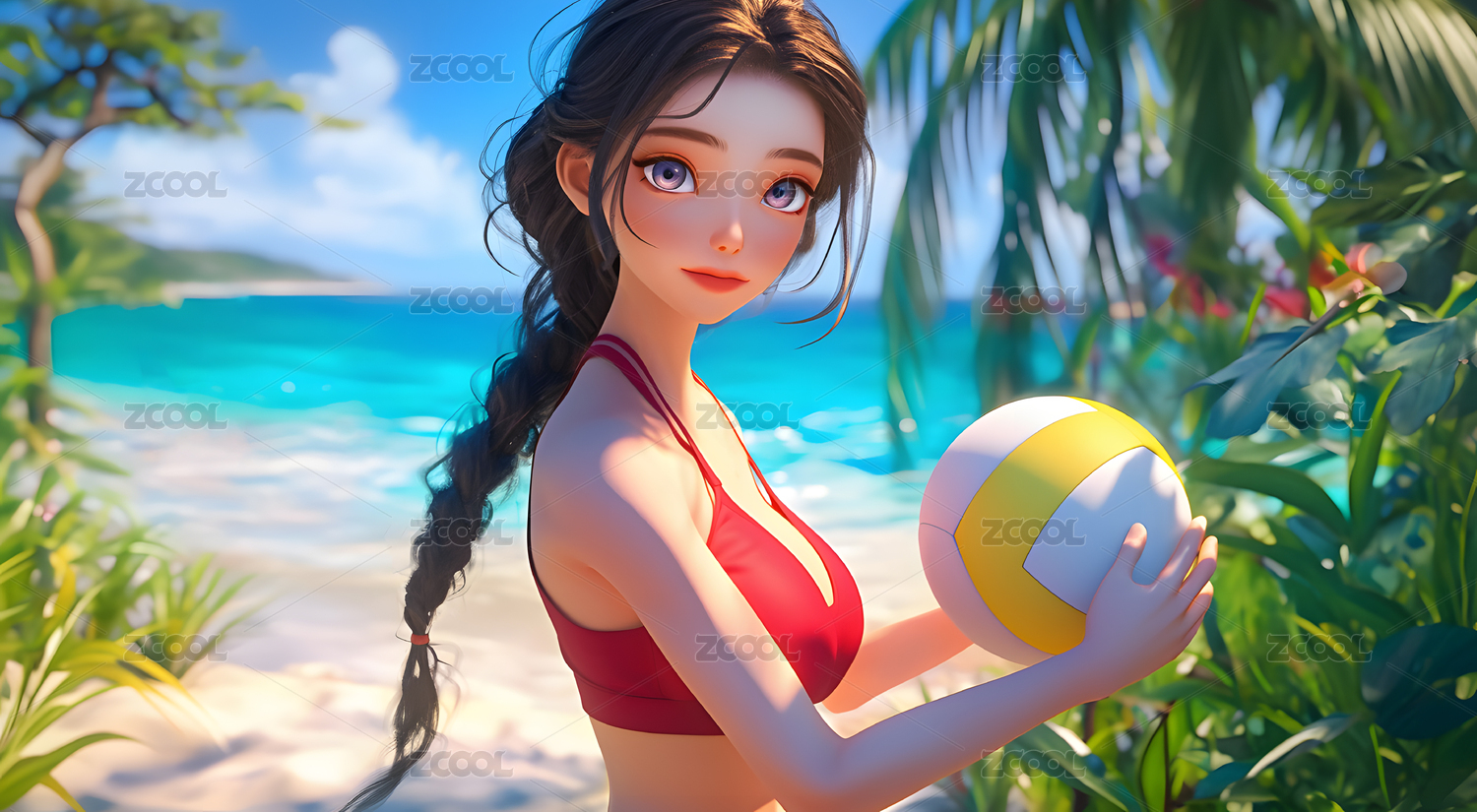 夏日海滩女孩卡通3D渲染图