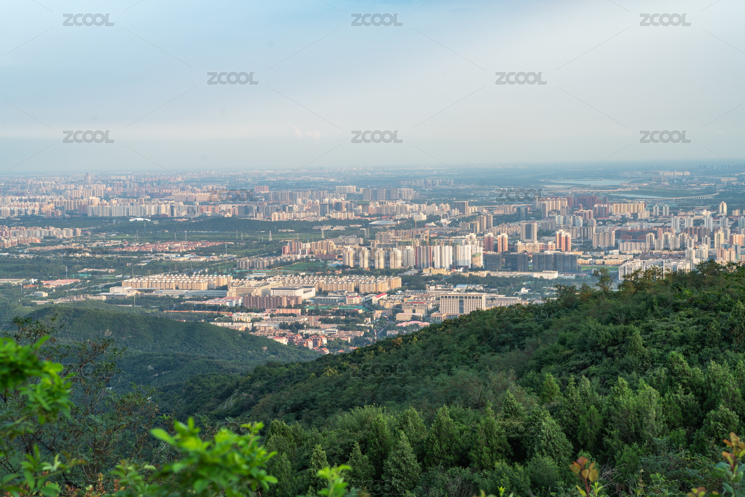 春天北京八大处公园视角长焦俯瞰城区及寺庙