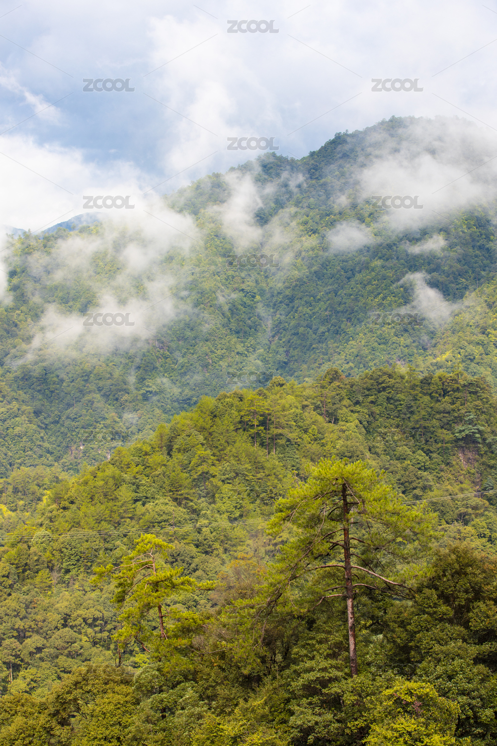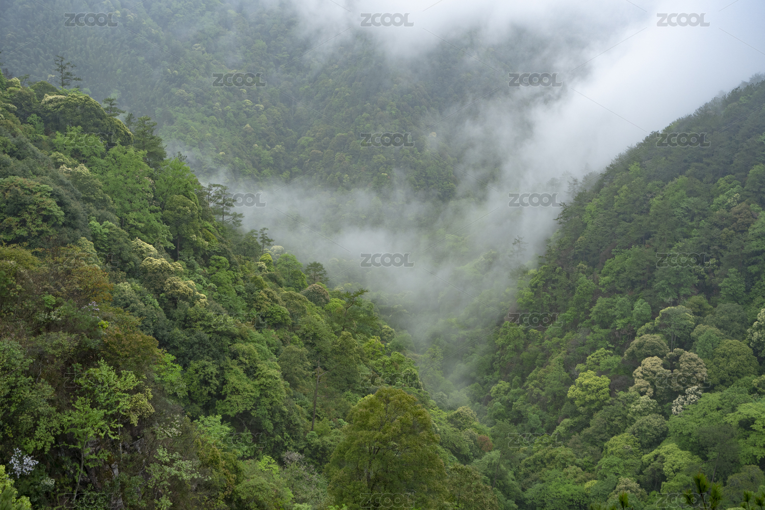 植被茂盛的山谷间云雾缭绕