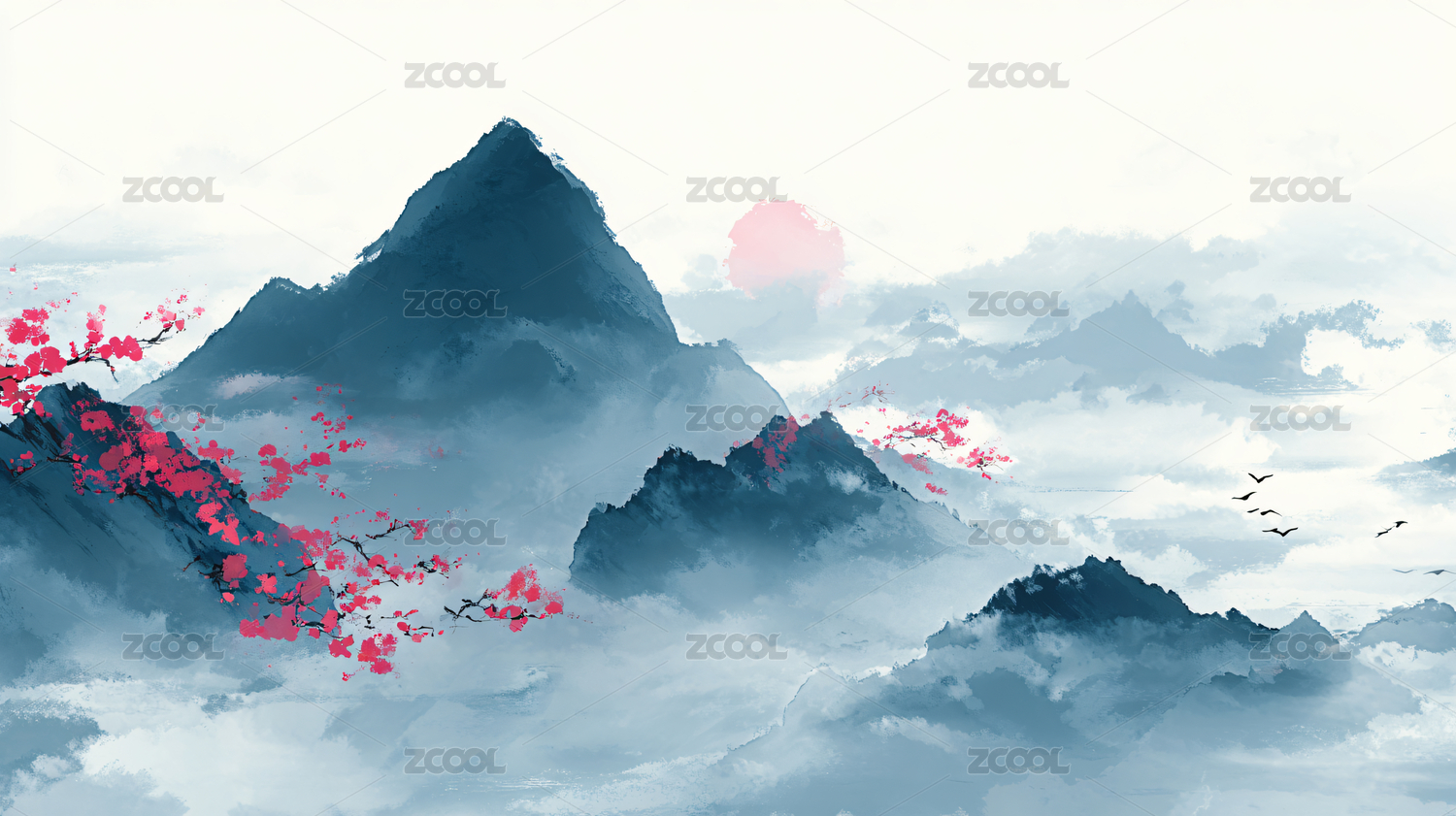 山水,山水画,水墨画,意境,国风,中国风,山脉,群山峻岭,樱花,二十四节气