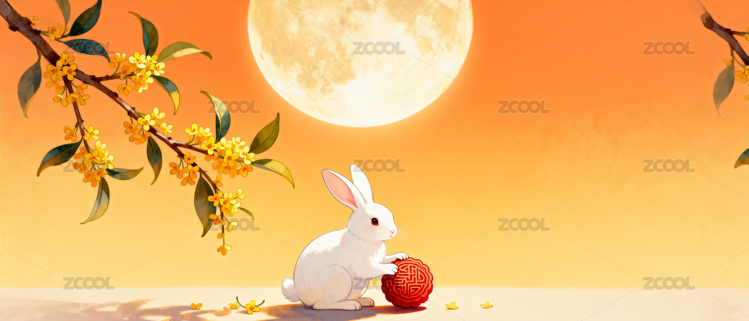 玉兔,月饼,桂花,中秋,月亮,AIGC202403,插画