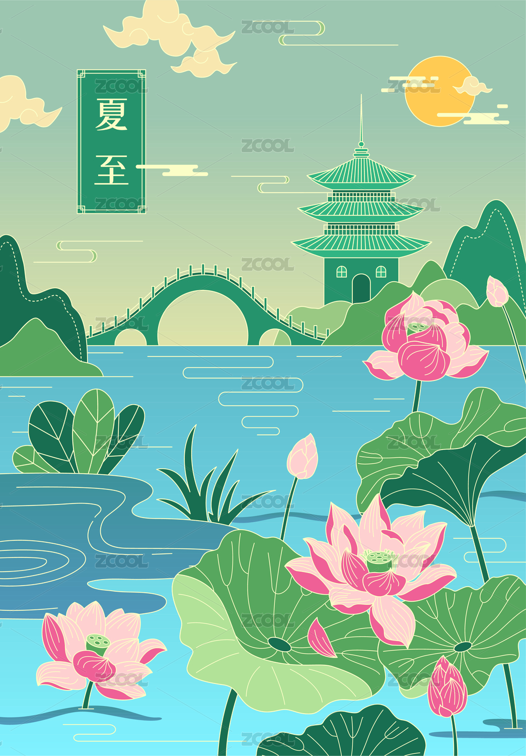 夏至荷花池塘国潮背景