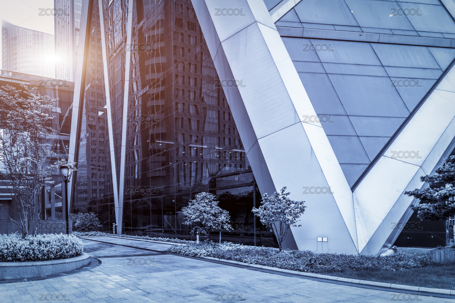 蓝色背景的办公楼出入口街景