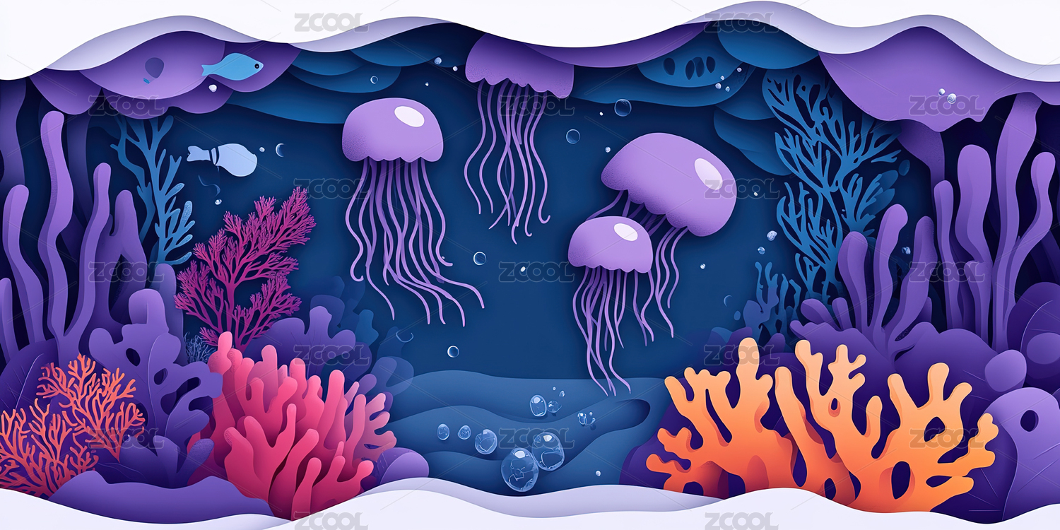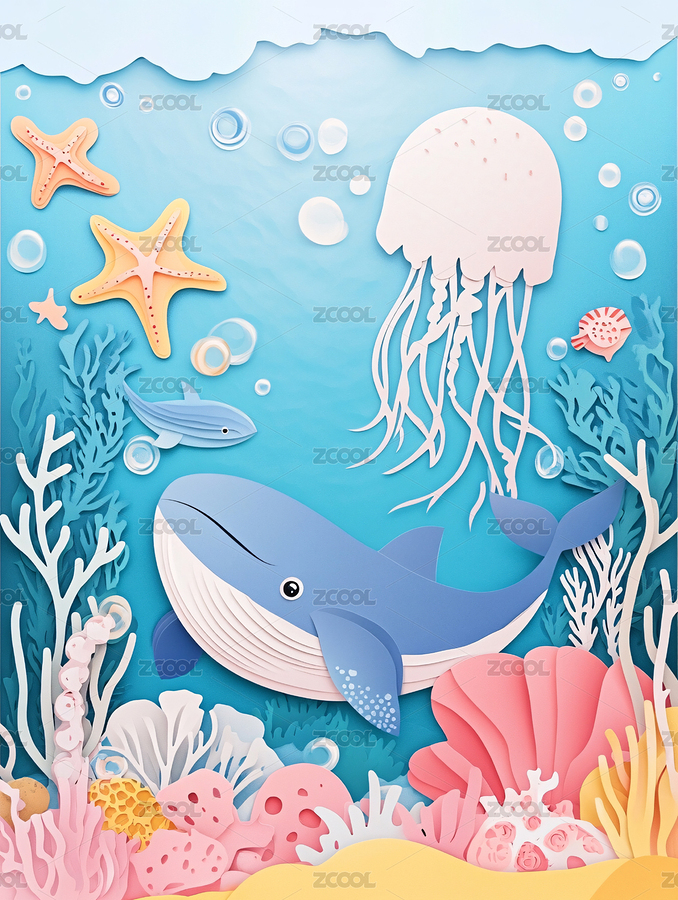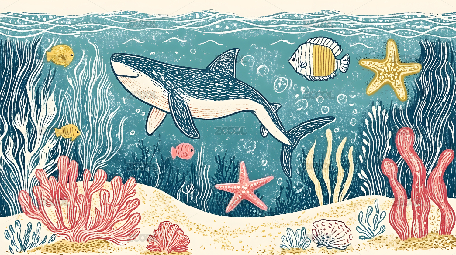 鲸鱼,珊瑚,海洋,海底,鱼,水母,海星,海底世界,卡通,插画