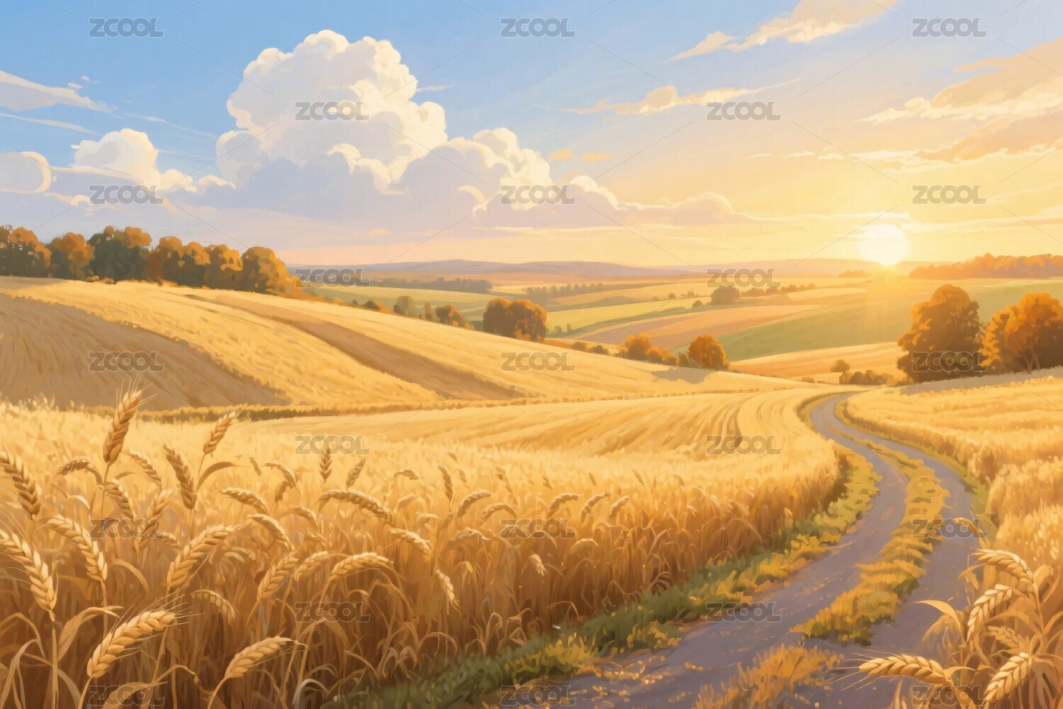 金色麦田小径夕阳下的宁静田园风光