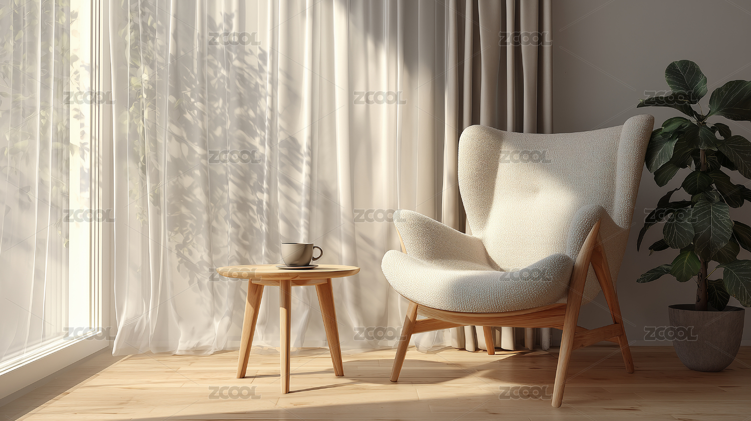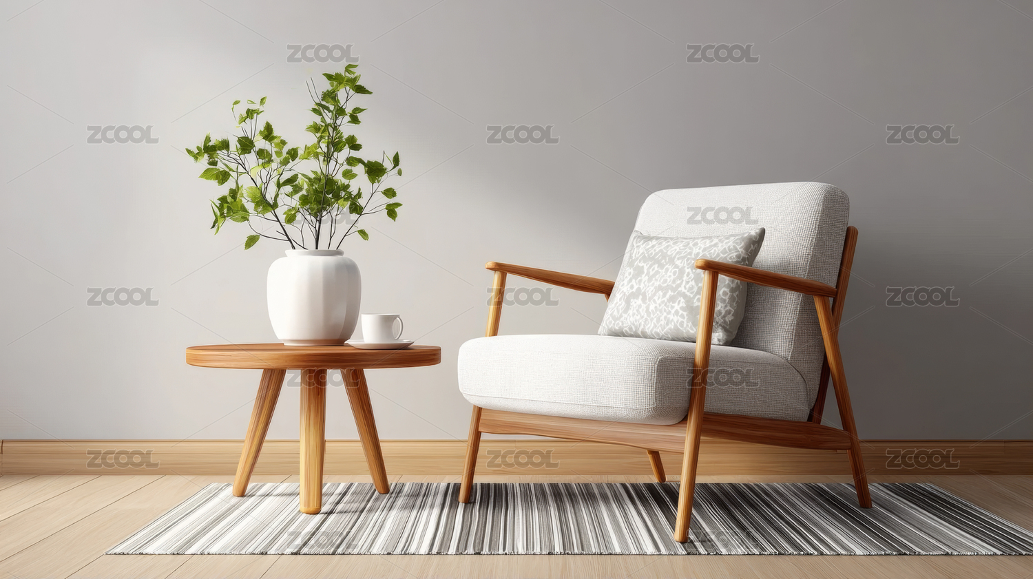 现代简约客厅角落里的扶手椅和绿植