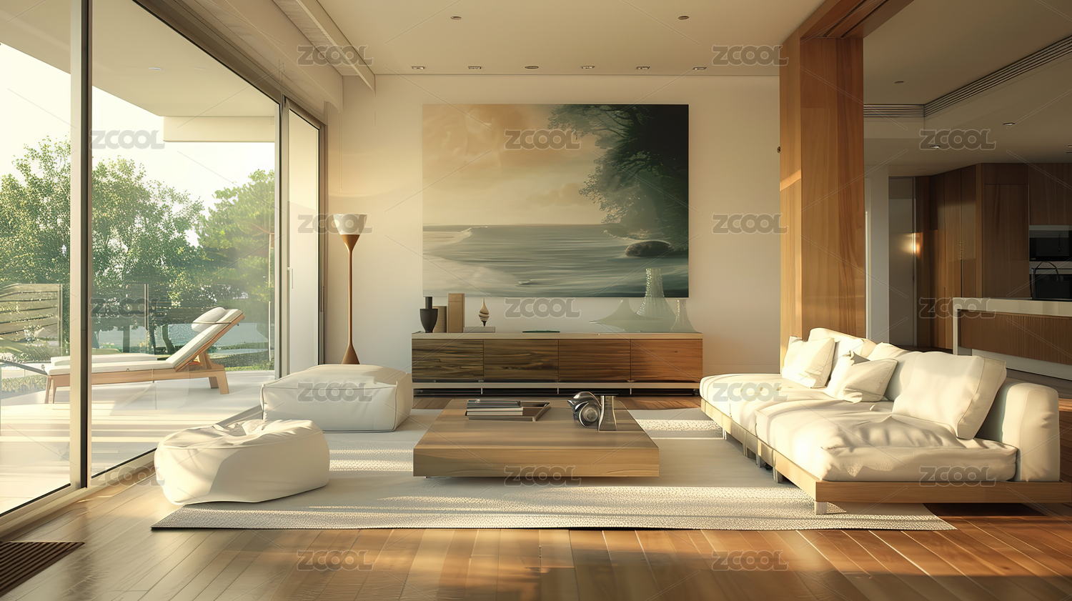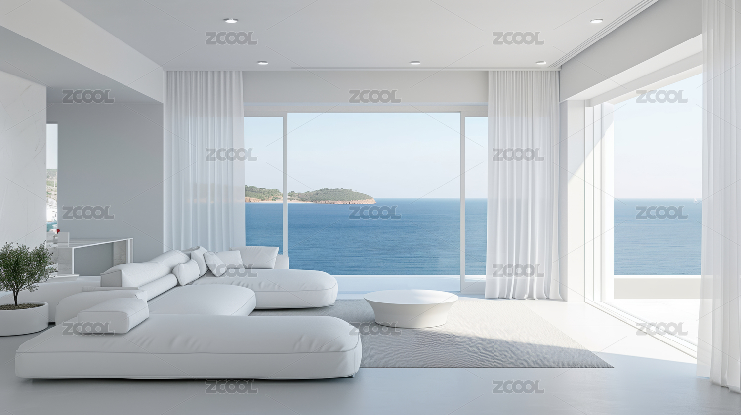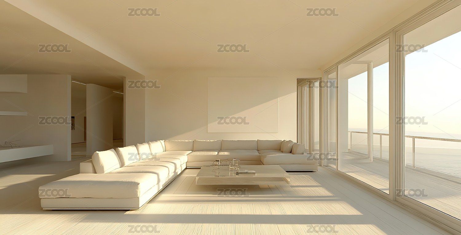 3D现代简约风时尚海边白色客厅场景