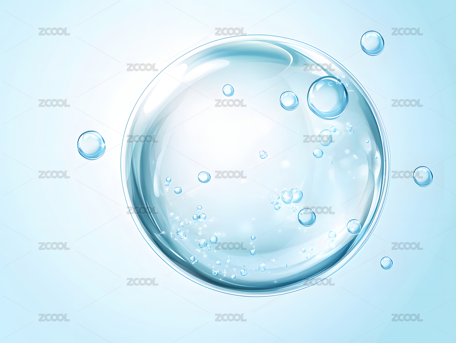 透明水滴悬浮在蓝色背景中