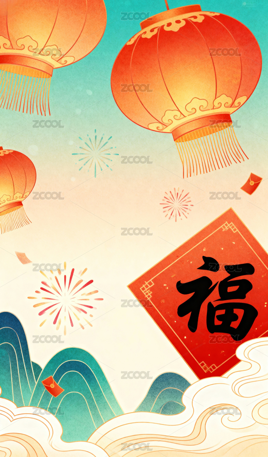 中国新年红色背景图,新年贺卡模板,红色的灯笼和祥云