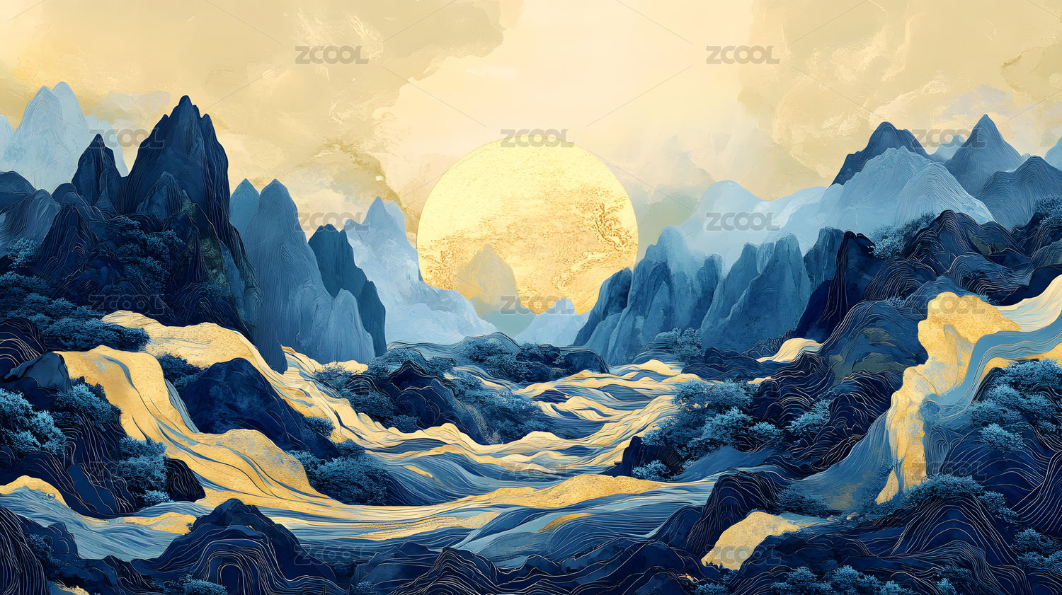 蓝色山水和金色太阳,金色描边创意国风山水
