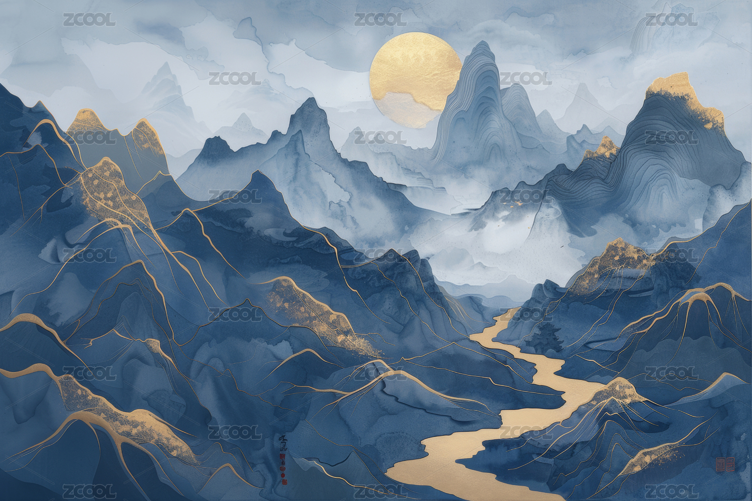 3D国风蓝色鎏金山脉中国山水风景插画