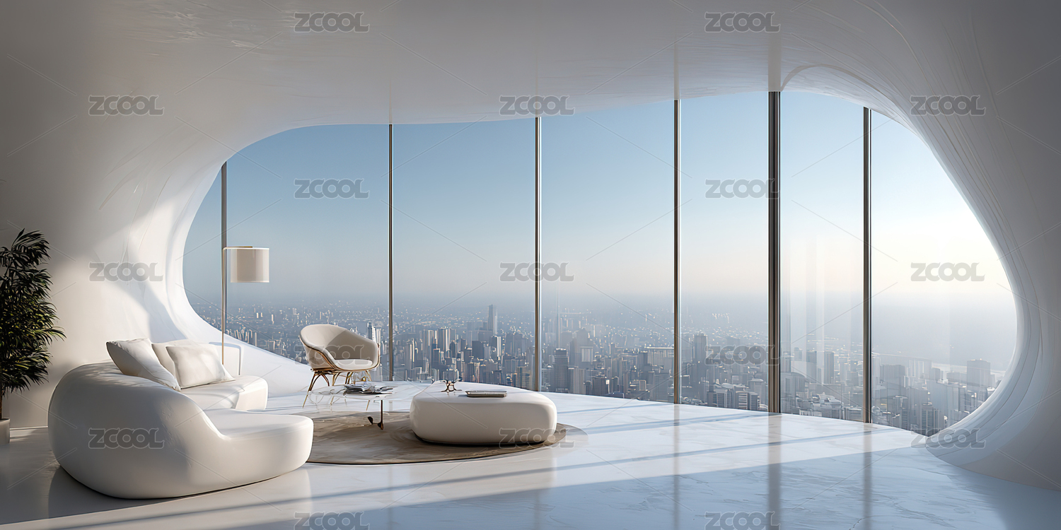 落地窗建筑内部大理石展厅带办公桌沙发窗外