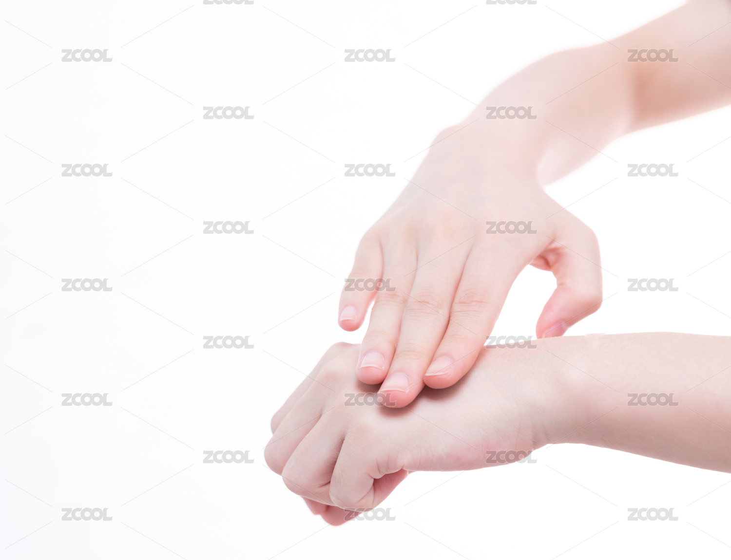 白色背景前右手抚摸左手背,涂抹,按压手势