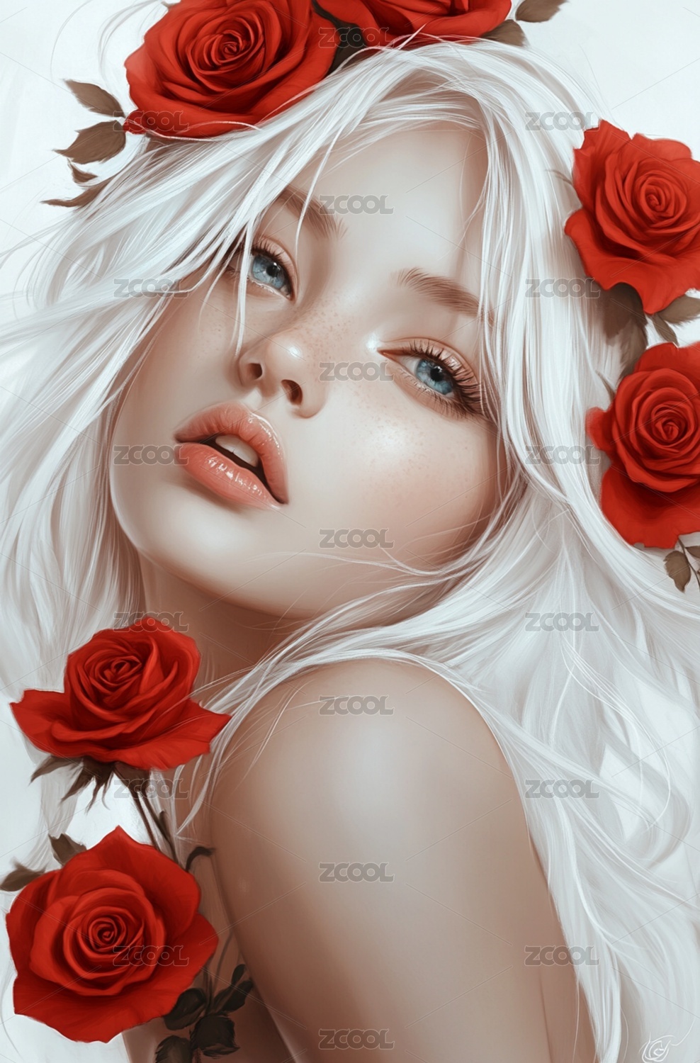 白发红玫瑰女孩浪漫唯美动漫海报油画壁纸