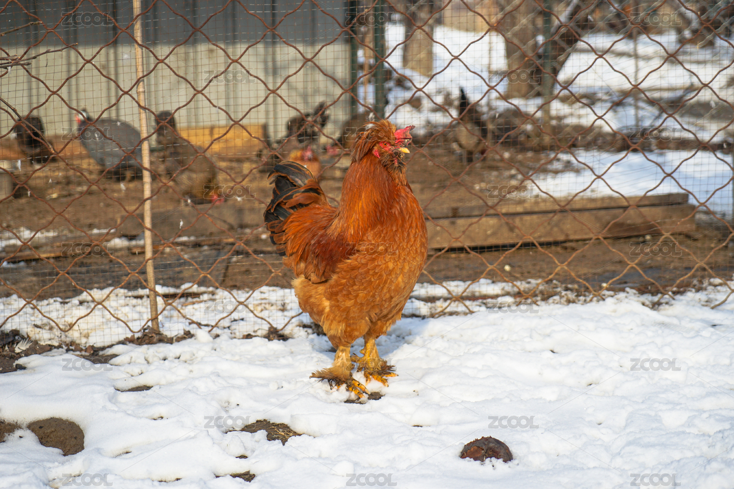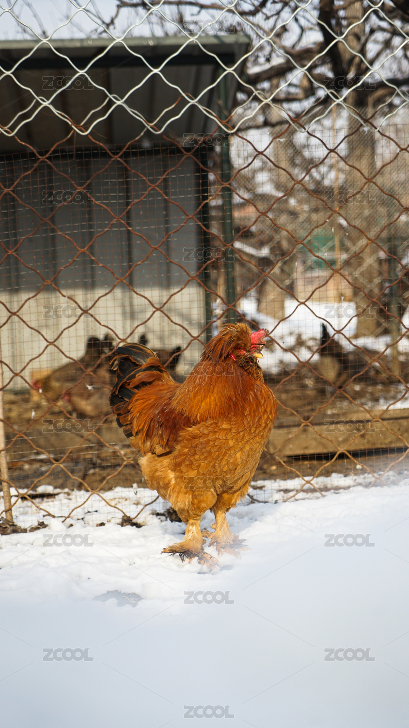 冬天白色雪地上的公鸡