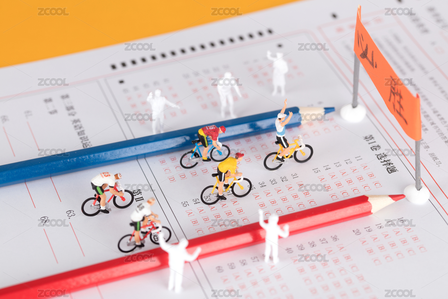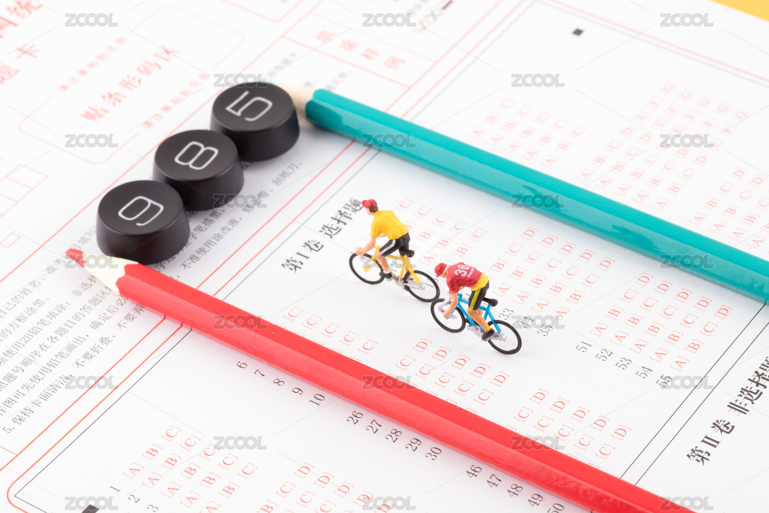 答题卡上的铅笔上一队骑车的微缩人偶模型前
