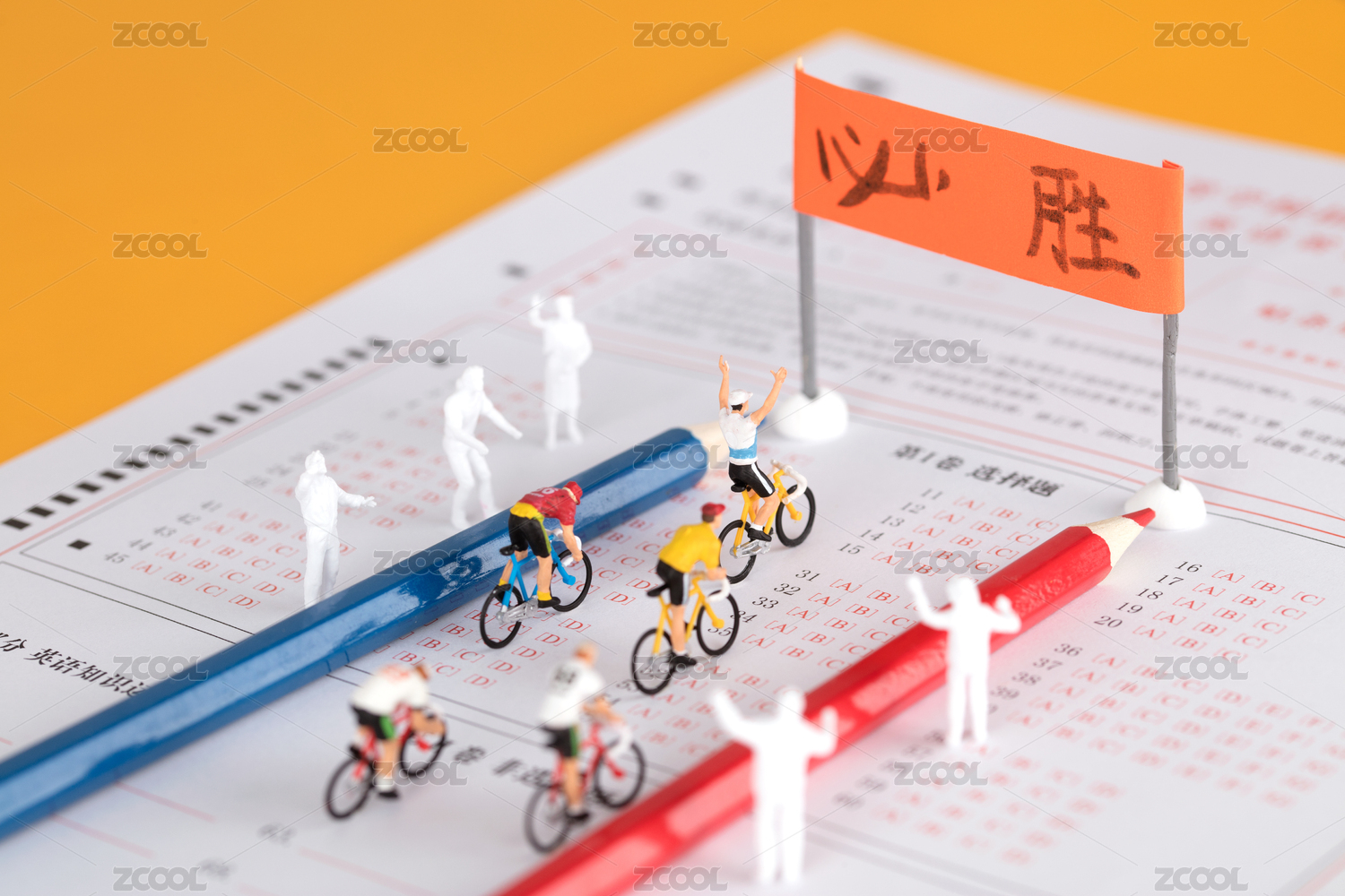 微缩创意在答题卡上骑自行车冲刺终点的考生