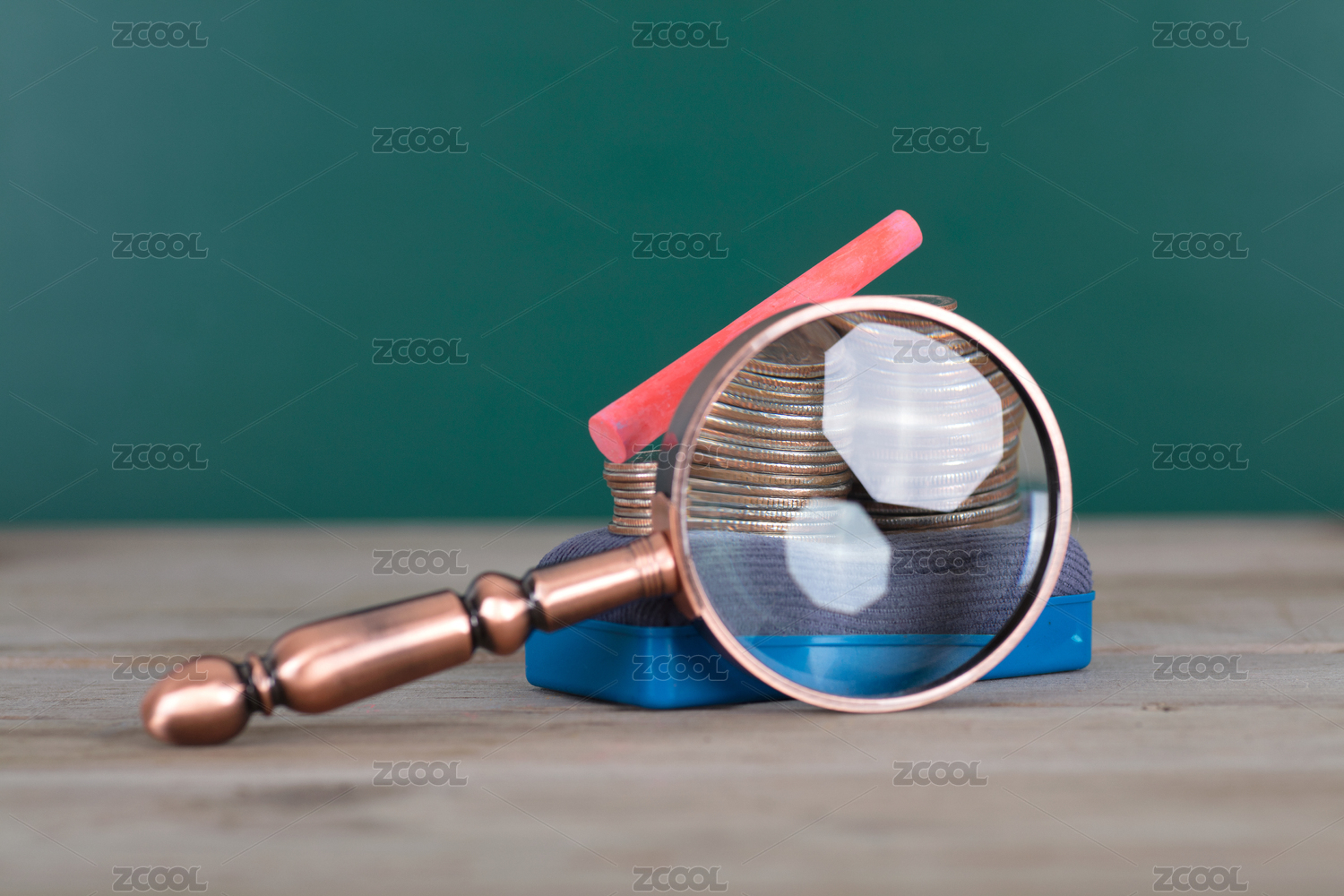 黑板前的放大镜和黑板擦及美元硬币