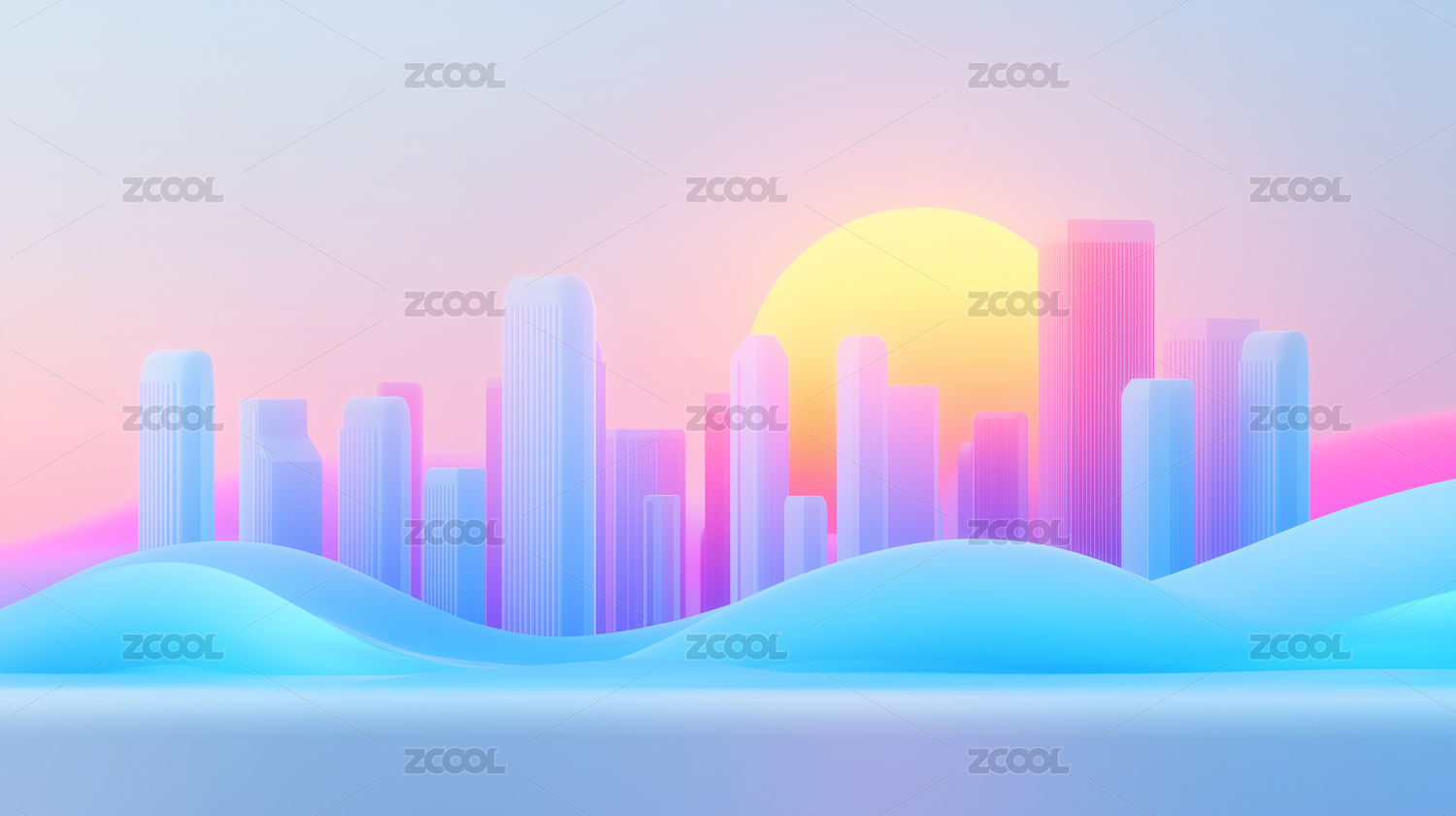 3d卡通日出下的缤纷城市建筑
