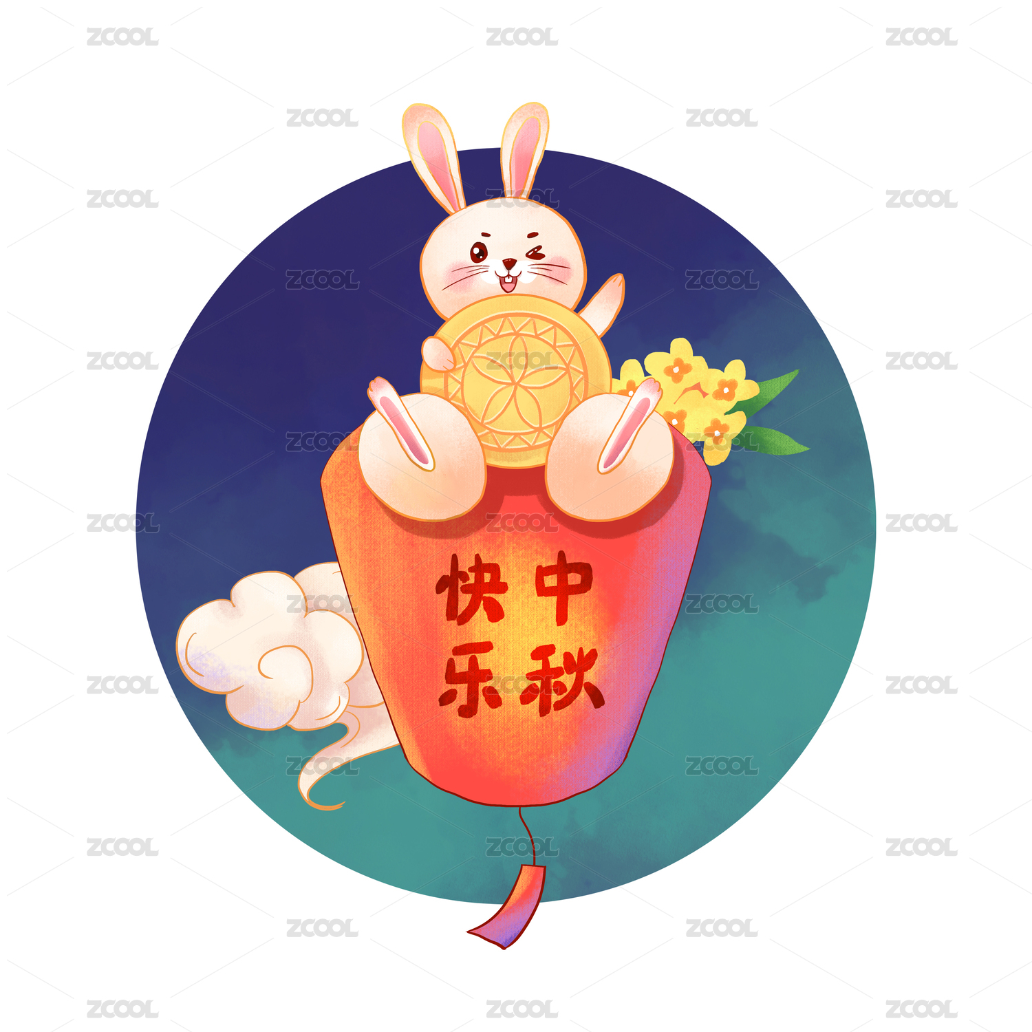 国潮风中秋兔子坐在孔明灯上吃月饼图