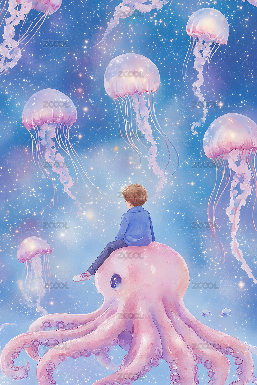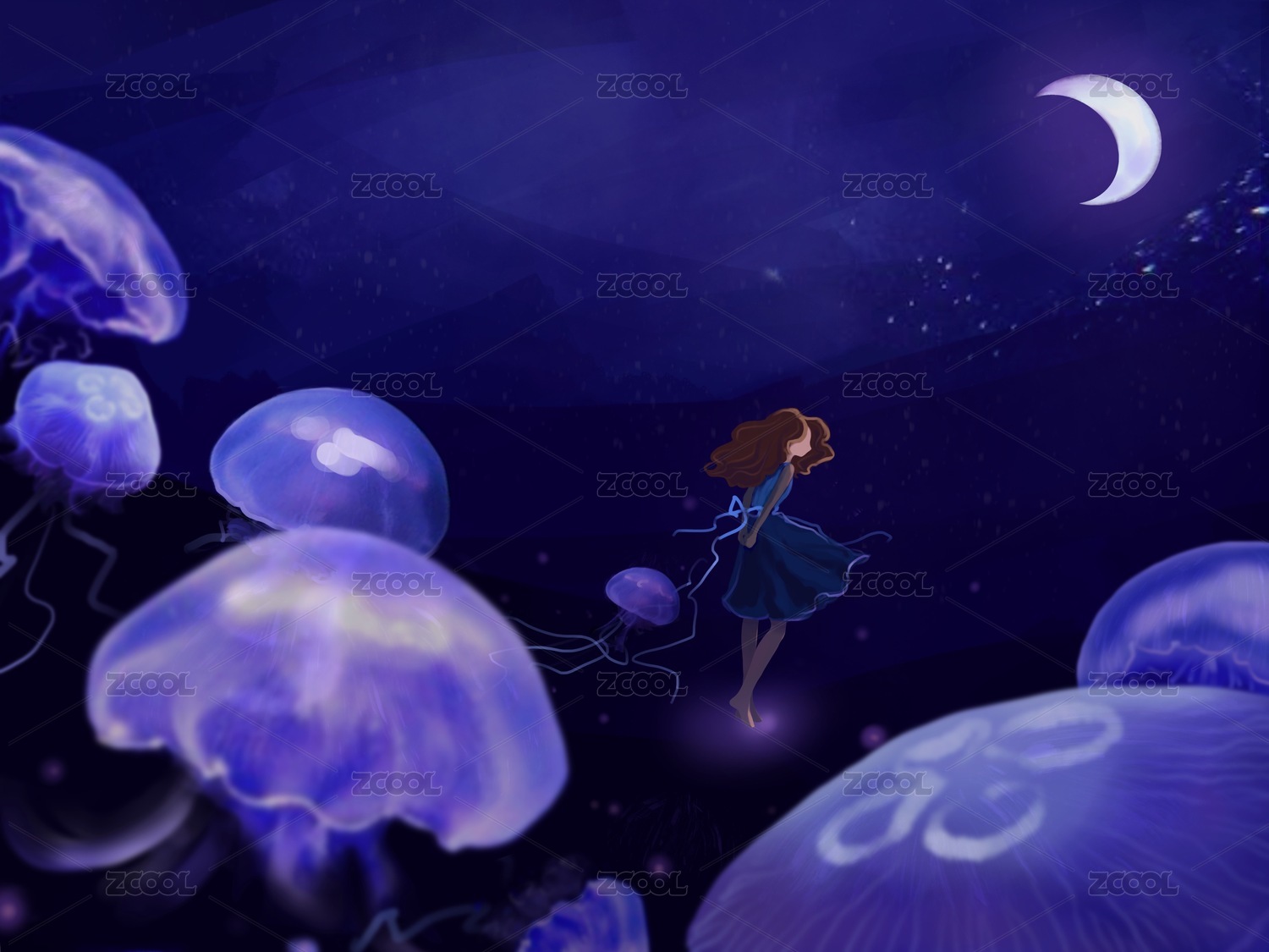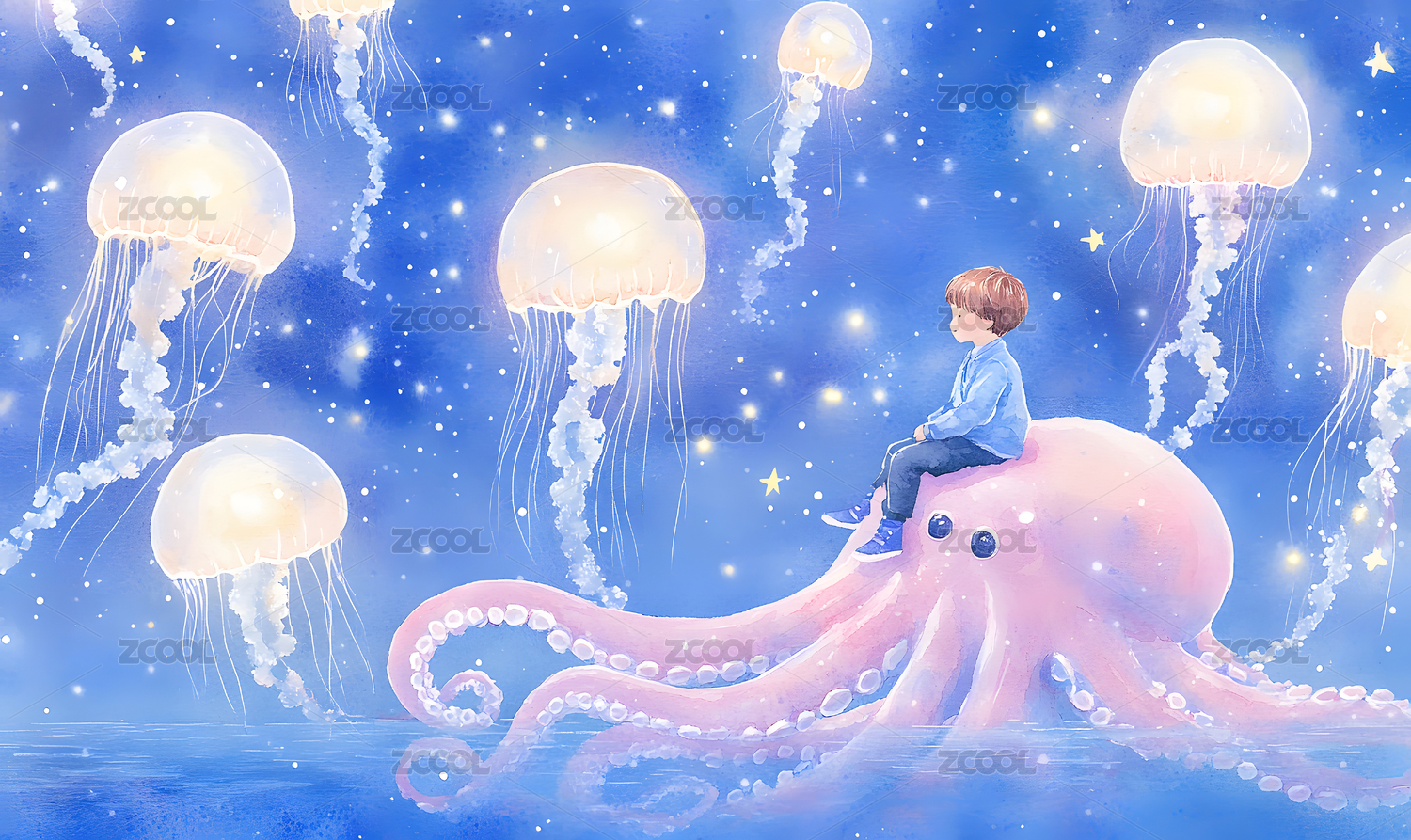 梦幻唯美插画海底里的精灵水母与星星