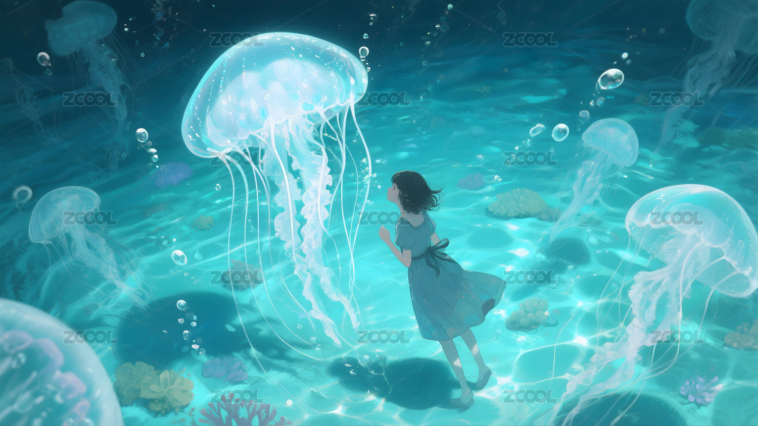 女孩在海底世界跟水母们一起荡秋千