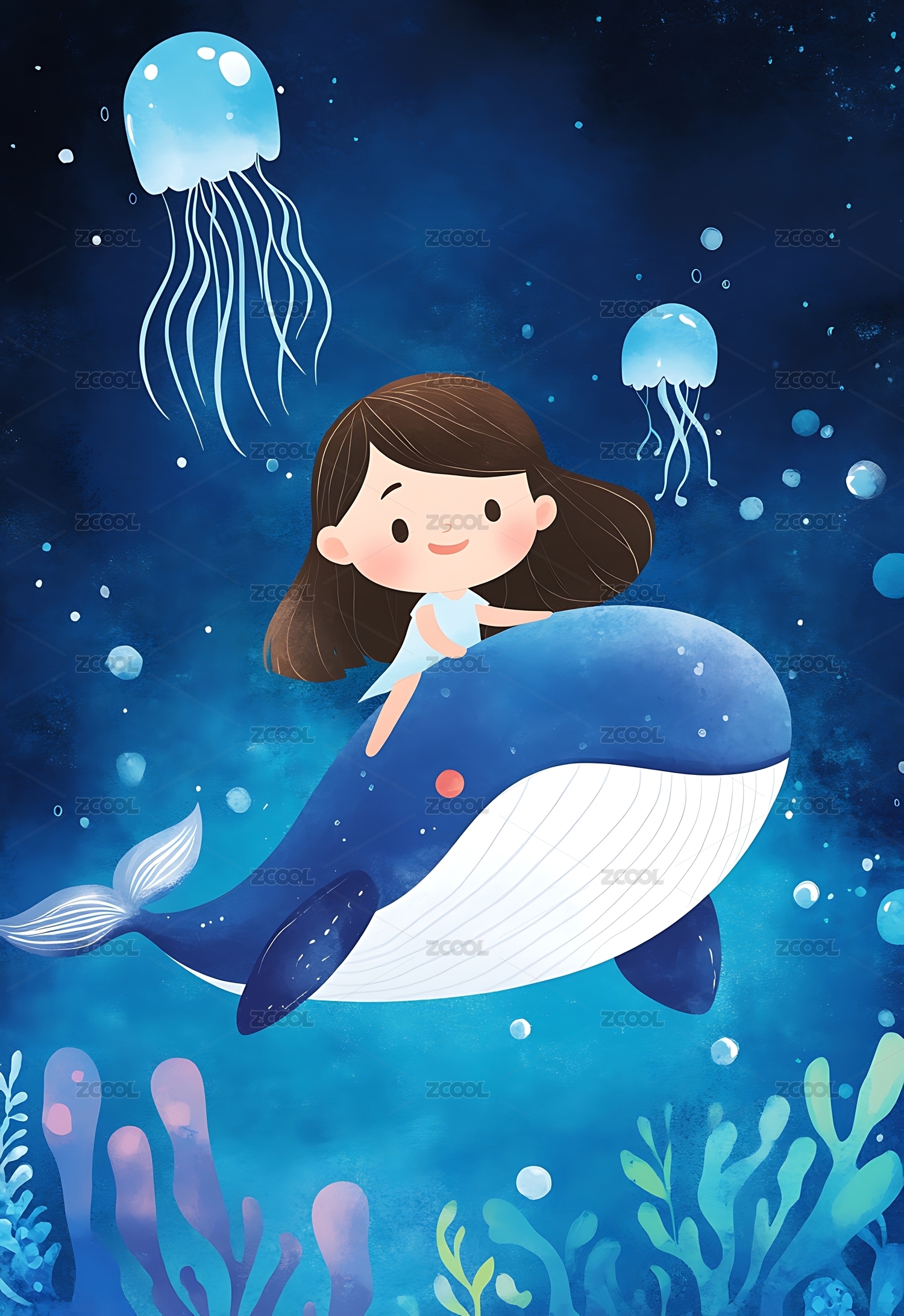 男孩,儿童插画,水母,大海,珍珠,深海,可爱,动物,梦幻,小朋友